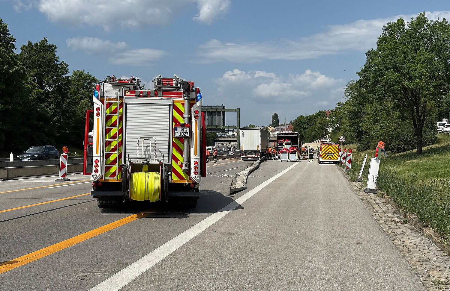Im Baustellenbereich fuhr ein Lastkraftwagen auf der A96 in Fahrtrichtung Lindau. Kurz nach der Auffahrt Laim fuhr der Lkw auf die Absperrung auf und schlitterte einige Meter weiter dahin. Dabei riss der Dieseltank des Sattelzuges auf. Diesel ergoss sich über die Fahrbahn. Durch vorbeifahrende Pkw bildete sich über einige Meter eine weitere Dieselspur.