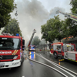 Da das Feuer und die Rauchentwicklung dadurch an Intensität gewannen, entschied sich der Einsatzleiter, weitere Kräfte nachzufordern und die Brandbekämpfung vorübergehend von außen über die geschaffenen Öffnungen mit den Wenderohren der Drehleitern fortzuführen, solange bis die Hitzeentwicklung eingedämmt und ein Innenangriff wieder möglich war.