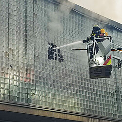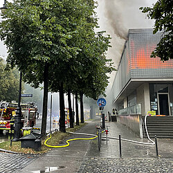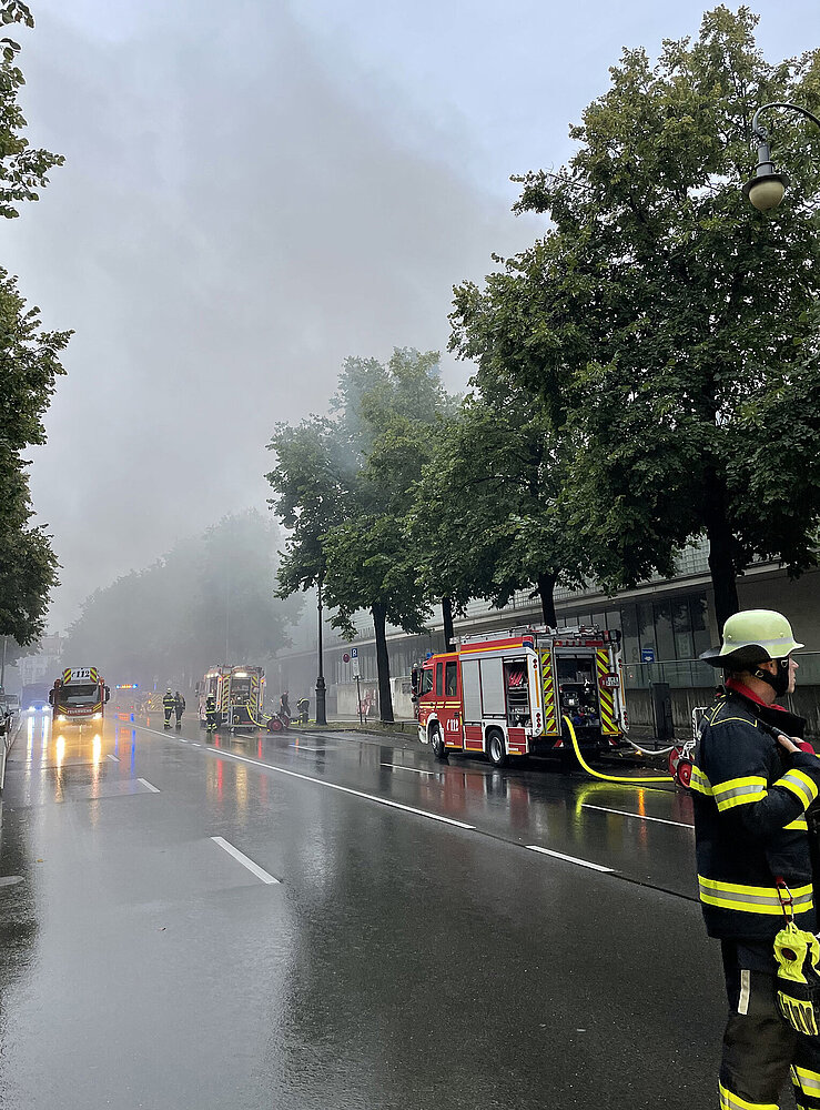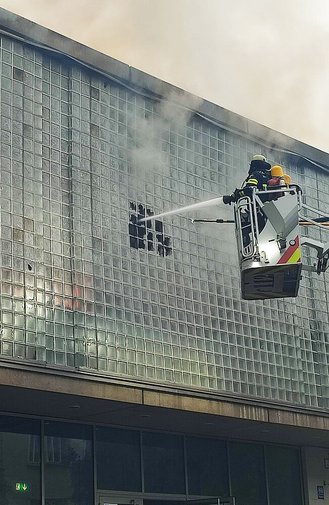 Um sechs Uhr in der Früh lief die automatische Brandmeldeanlage des Gebäudes in der Integrierten Leitstelle München ein. Als der disponierte Löschzug an dem Objekt ankam, war eine starke Rauchentwicklung aus dem Dachbereich zu erkennen. Da der Einsatzleiter anfangs einen Dachstuhlbrand vermutete, forderte er umgehend einen weiteren Löschzug und das Sonderlöschmittelfahrzeug an.