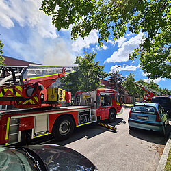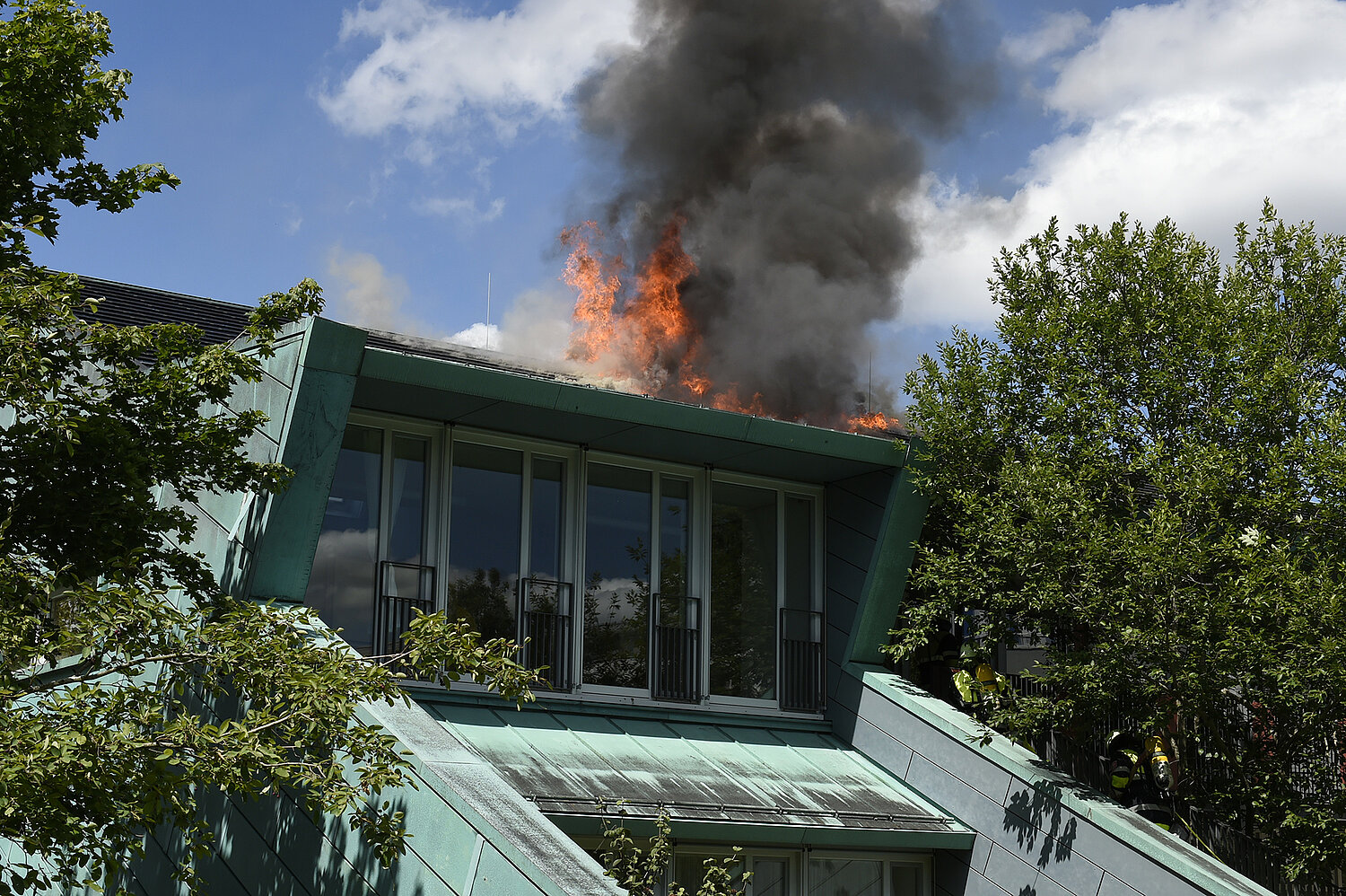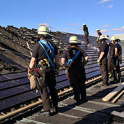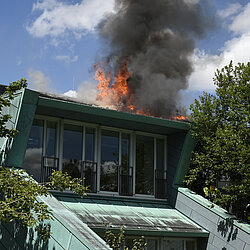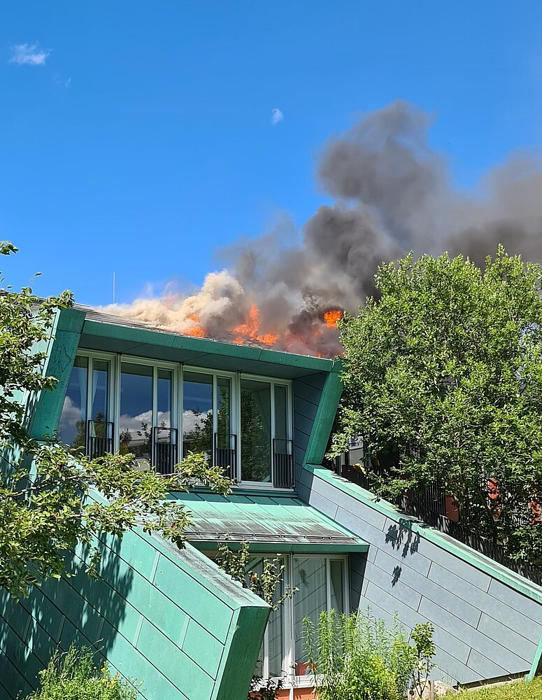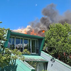 Auf der Anfahrt konnten die Einsatzkräfte bereits Rauch und Flammen auf dem Dach des Gebäudes erkennen. Sofort wurden die Löschmaßnahmen mit zwei C-Rohren eingeleitet. Zeitgleich wurden zwei zusätzliche Drehleitern mit jeweils einem C-Rohr eingesetzt um die Kollegen von außen zu unterstützen.