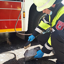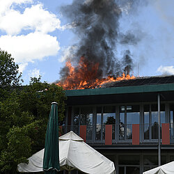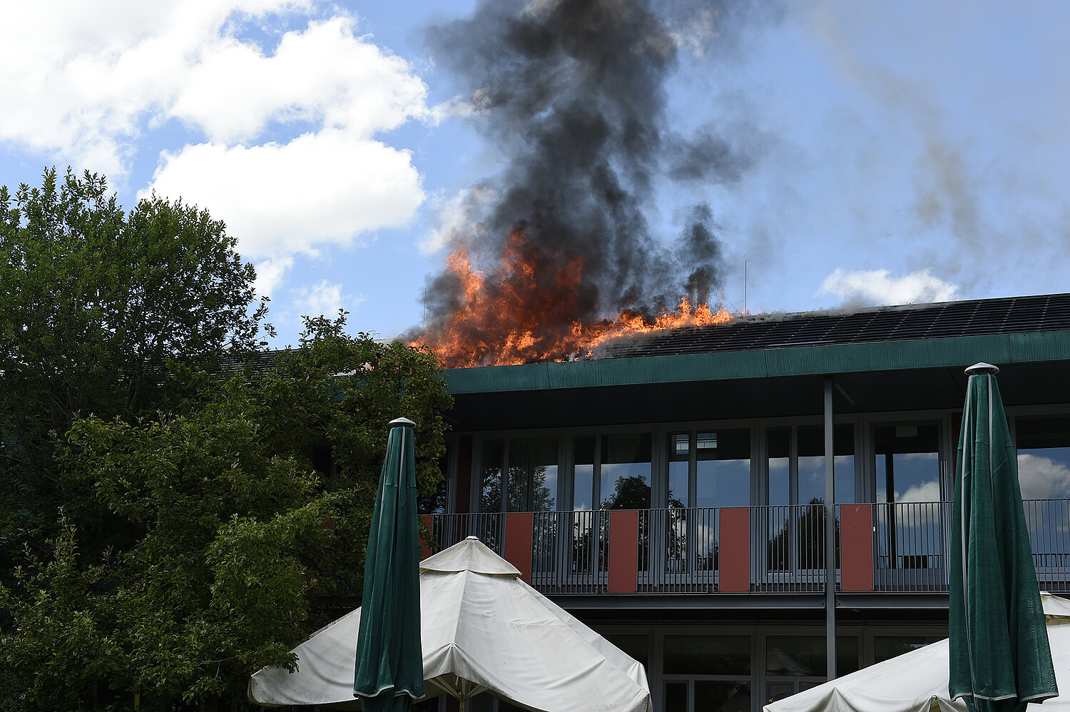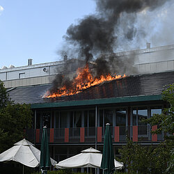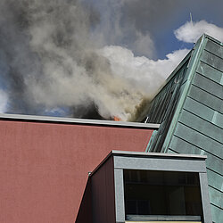 Die Einsatzkräfte im Innenangriff schlugen mit einer Axt zwei Glastüren ein und verschafften sich somit Zutritt ins Gebäude. Von innen und außen wurde die Dachhaut geöffnet um den Brand zu bekämpfen. Nach zirka zweieinhalb Stunden war das Feuer aus. Um das Gebäude vor dem Wetter zu schützen hatten die Kollegen eine Abdeckplane angefordert, die über das geöffnete Dach gelegt wurde.