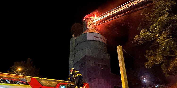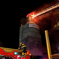 Über Angestellte einer benachbarten Firma wurde ein brennendes Fahrzeug in einem Betonwerk gemeldet. Bei Eintreffen der Feuerwehr standen bereits mehrere Fahrzeuge und ein Förderband in Flammen. Umgehend wurden weitere Einsatzkräfte nachalarmiert. Die Einsatzkräfte leiteten einen massiven Löschangriff ein, um sechs Betonmischer und einen Radlader sowie weitere Einrichtungsgegenstände abzulöschen. Das Feuer auf dem Förderband erreichte auch die Spitze des Mischsilos und setzte dieses in Flammen.