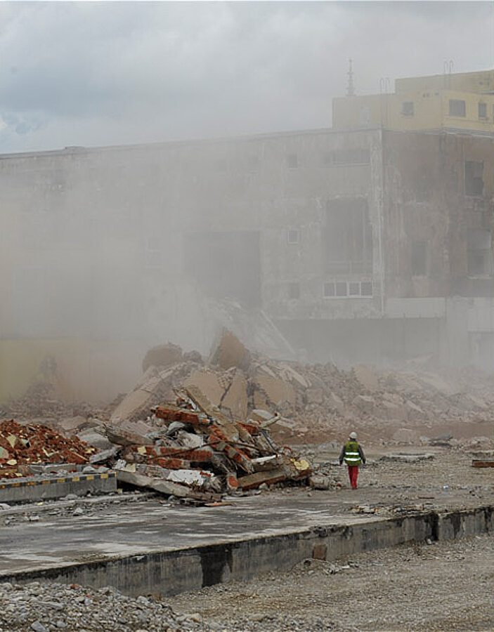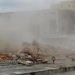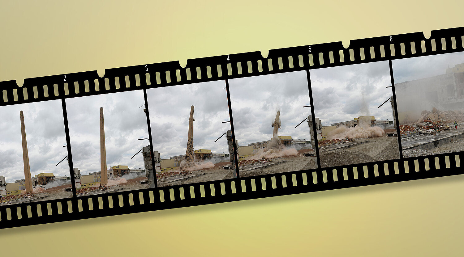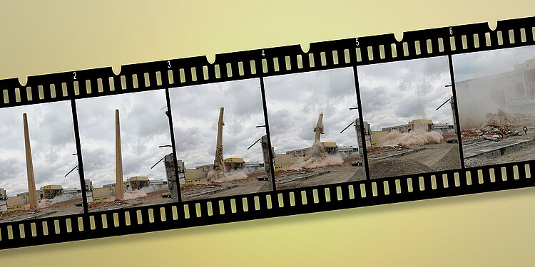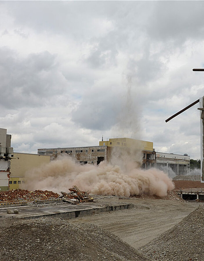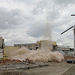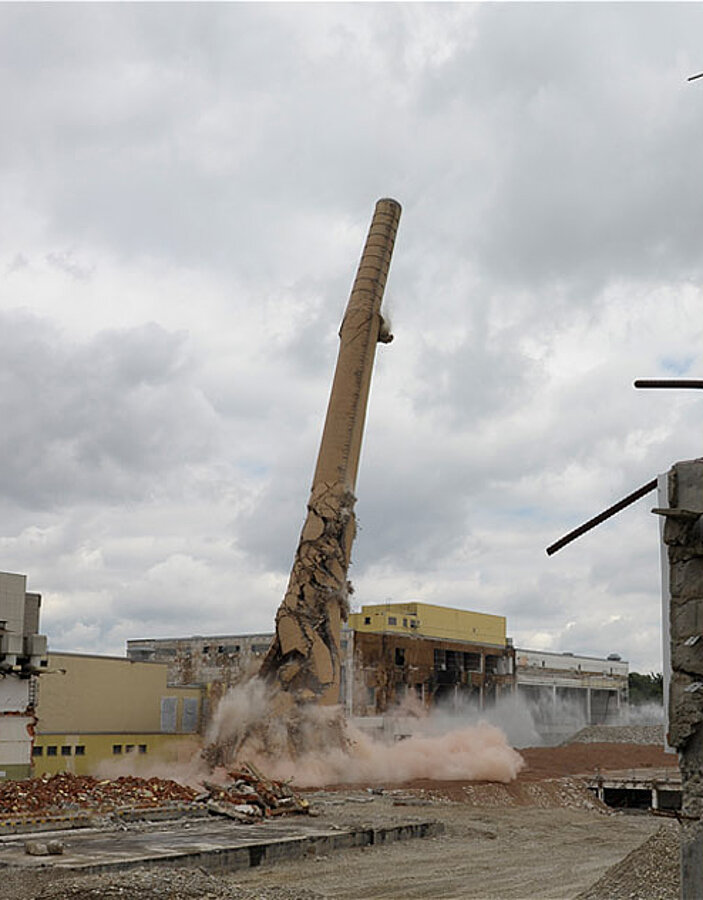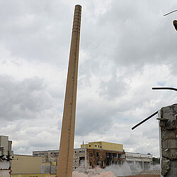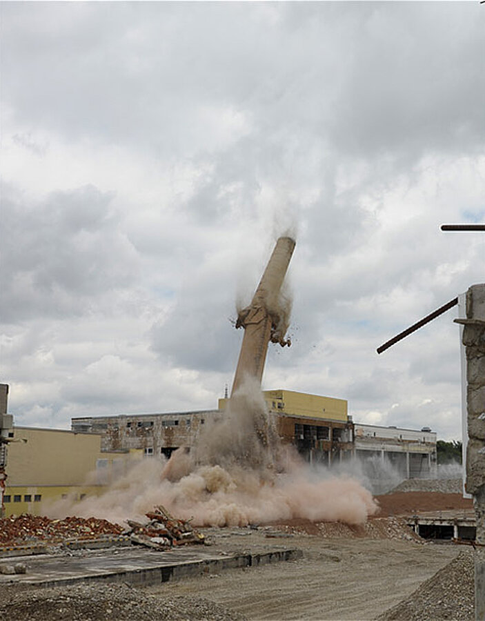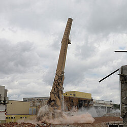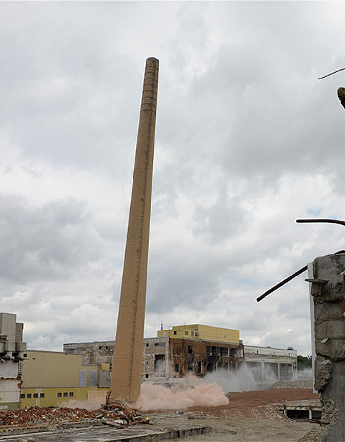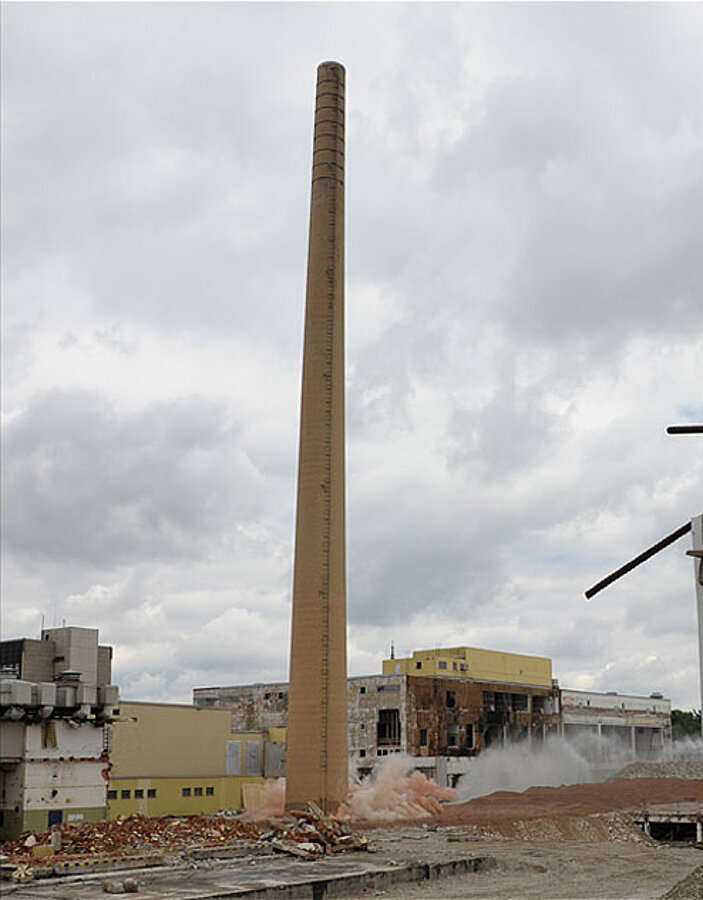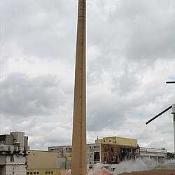 50 Jahre lang stand der Schornstein auf dem ehemaligen Betriebsareal der Paulaner Brauerei. Mit dem Befehl „1, 2, 3, Zündung“, fiel der 75 Meter hohe Turm in Richtung Nordosten in sich zusammen.