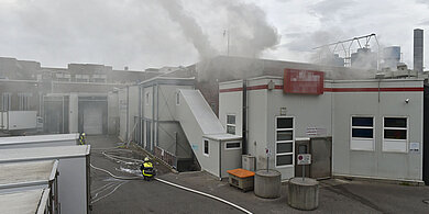 | In einer rund 30 x 40 Meter großen Halle, in der verschiedene Fleischverarbeitende Betriebe untergebracht sind, hat sich durch unbekannte Ursache das Dachgebälk entzündet.