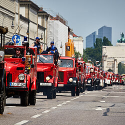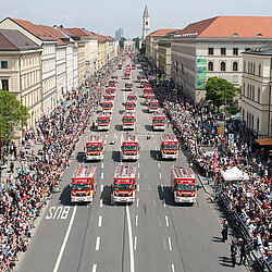 „So viele rote Autos auf der Leopold- und Ludwigstraße gab es noch nie – und auch weltweit ist das seit dem heutigen Tag die größte Anzahl an Feuerwehr- und Einsatzautos, die es je bei einer Parade gegeben hat,“ schwärmt Rupert Saller, der Kommandant der Freiwilligen Feuerwehr München.