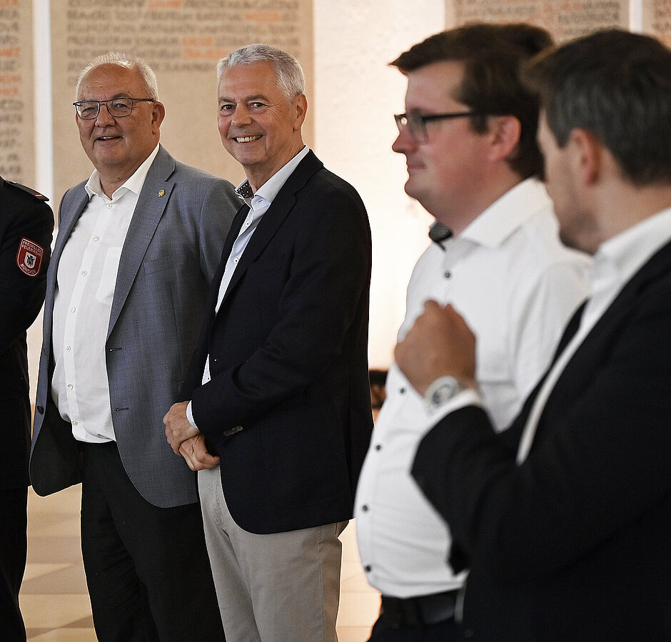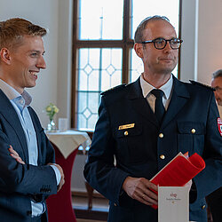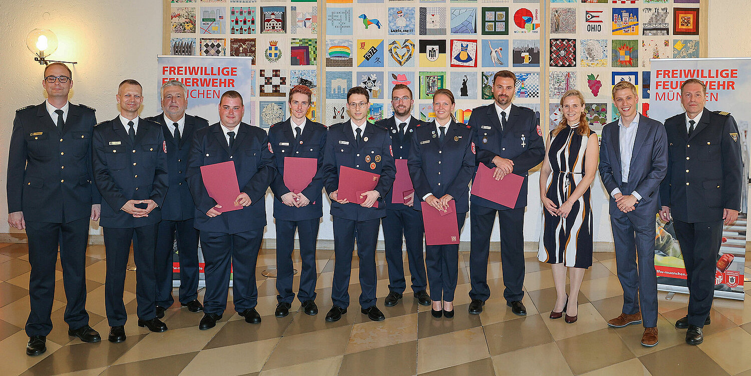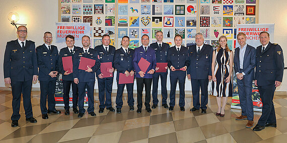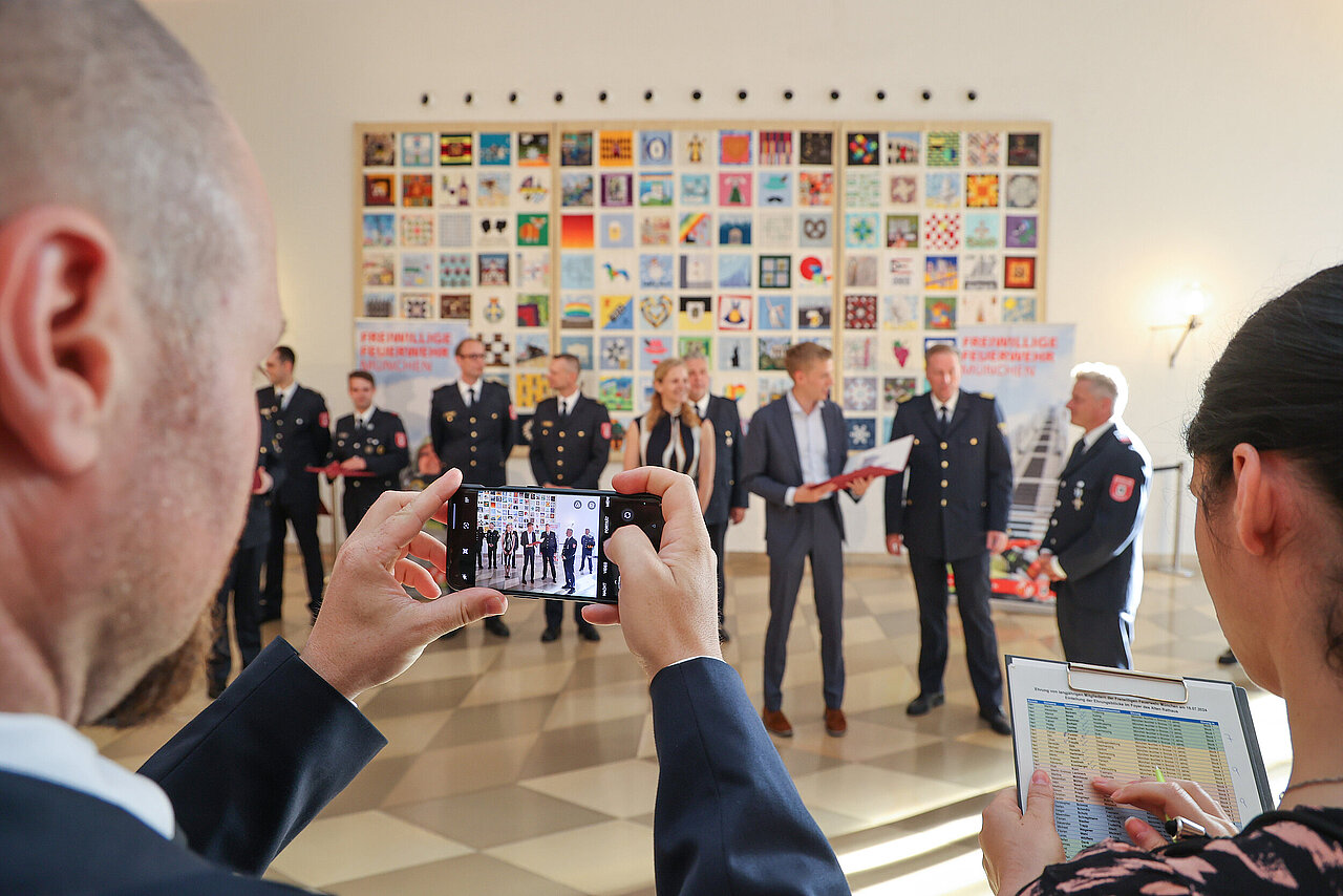 Die weiteren 64 Ehrungen führten dann Bürgermeister Dominik Krause, Oberbranddirektor Wolfgang Schäuble und Stadtbrandrat Claudius Blank zusammen mit Kreisverwaltungsreferentin Dr. Hanna Sammüller-Gradl im Foyer des Alten Rathaussaals durch.