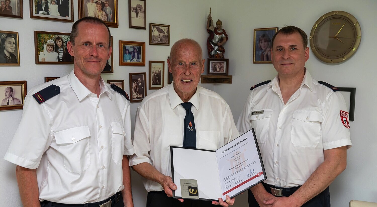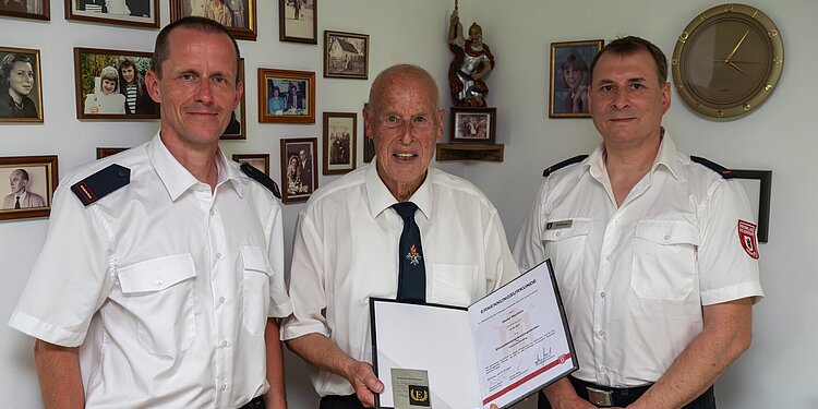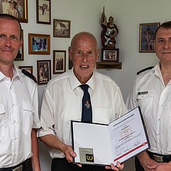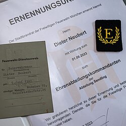 Stadtbrandrat Claudius Blank ernannte Dieter Neubert nun zum Ehrenabteilungskommandanten. Die Urkunde überreichten der heutige Abteilungskommandant Bernhard Meßmer und sein Stellvertreter Horst Reinelt.