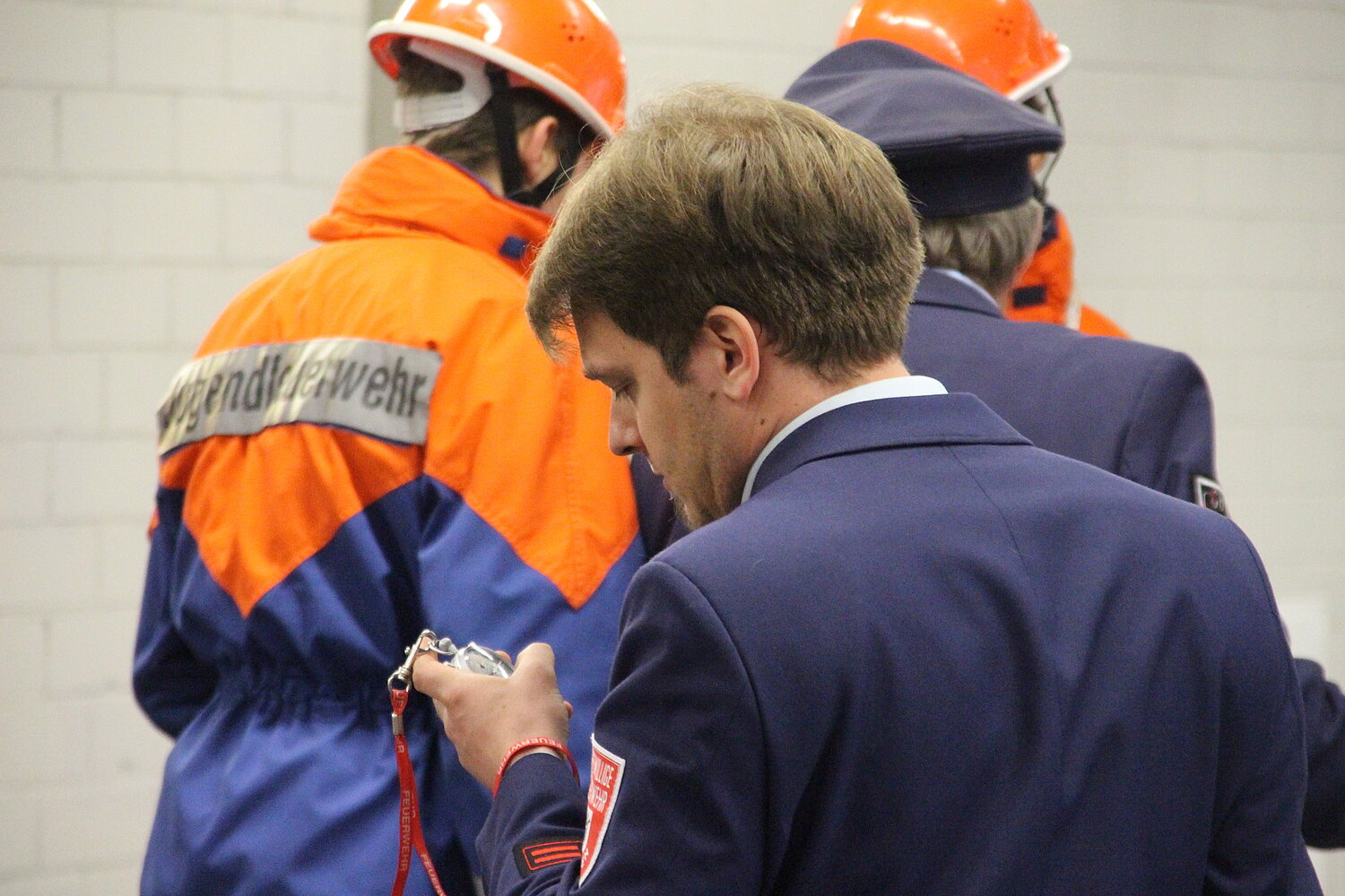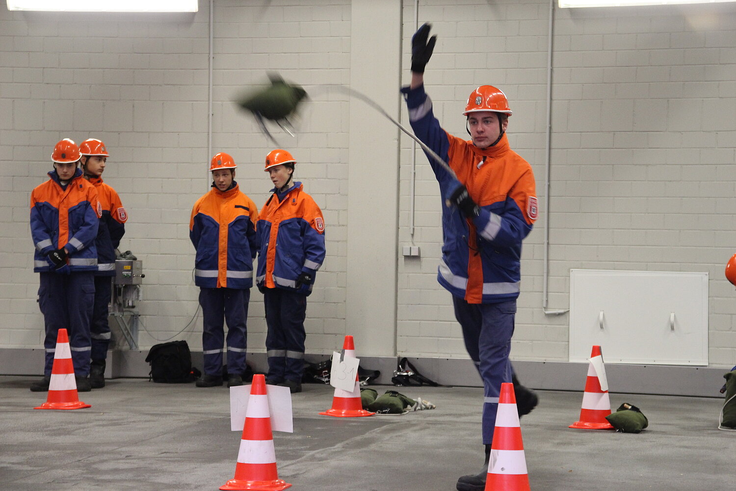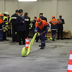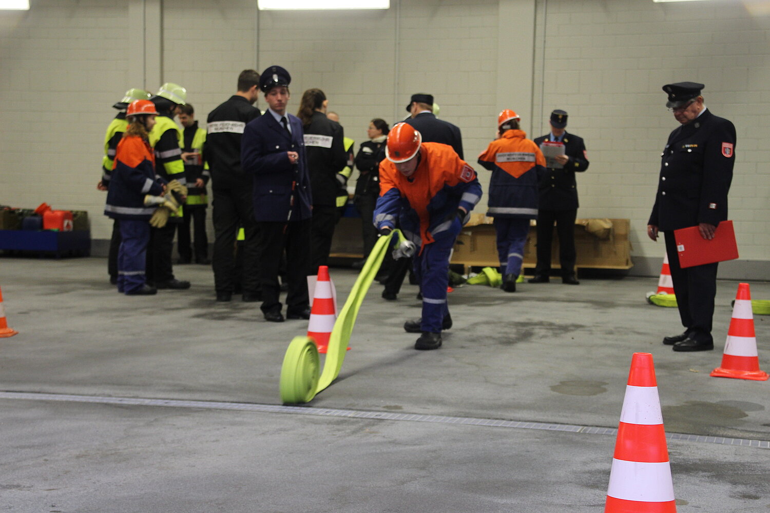 Bereits am frühen Samstagmorgen trafen die Teilnehmer, Ausbilder und Prüfer im neuen Gerätehaus der Abteilung Stadtmitte (Feuerwache 4) in Schwabing ein. Ein theoretischer Test und eine praktische Prüfung des Wissenstests gab es zum "Warmmachen". Im Anschluss wurde es noch anspruchvoller. An neun Stationen mussten die Jugendlichen all ihr Können abrufen. Aufgrund des schlechten Wetters wurden acht Stationen der Bayerischen Jugendleistungsprüfung in den Fahrzeughallen aufgebaut.