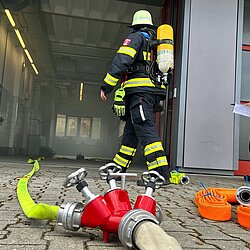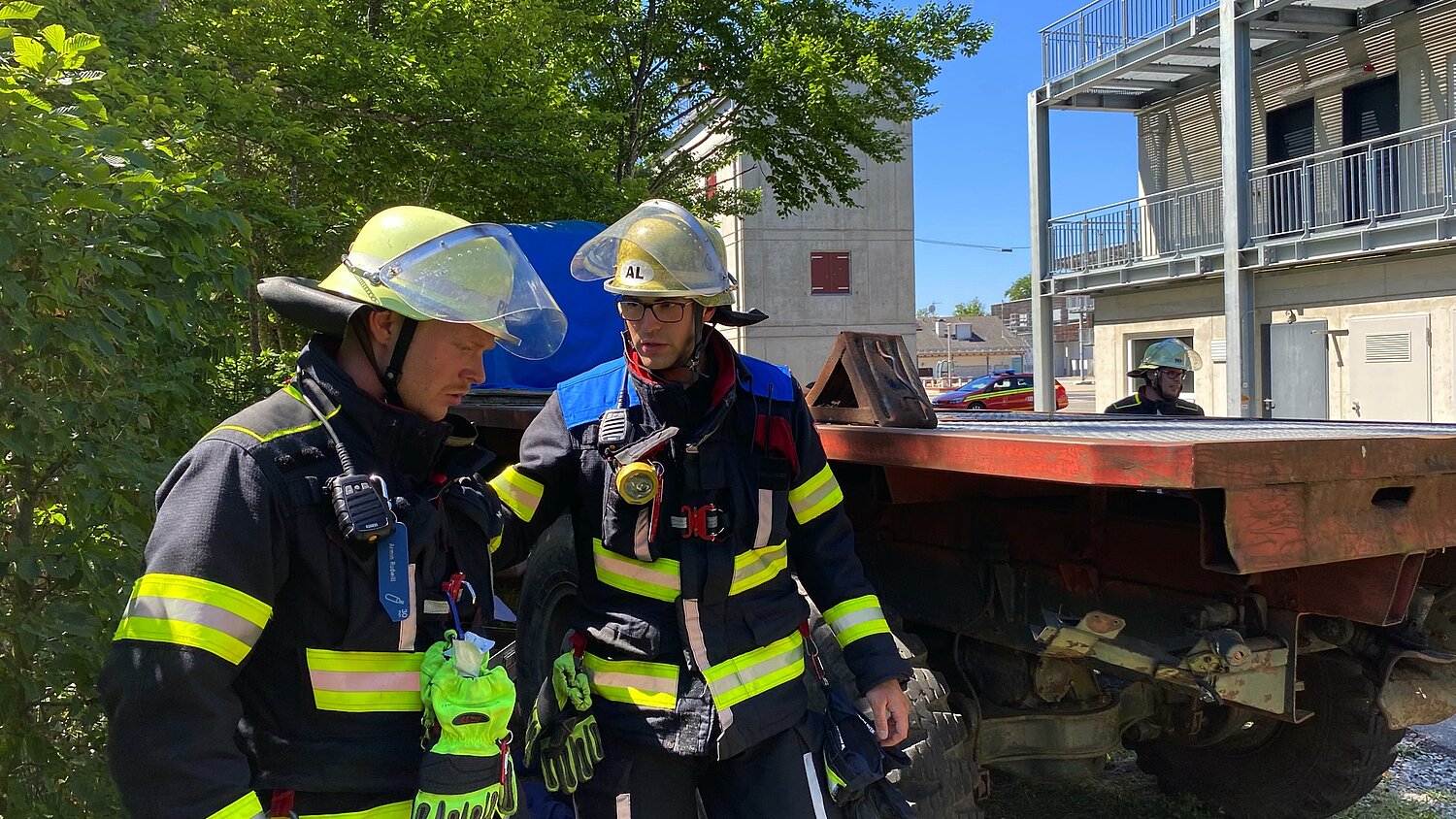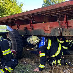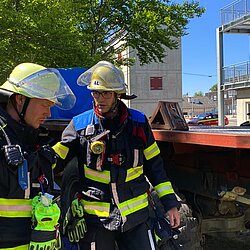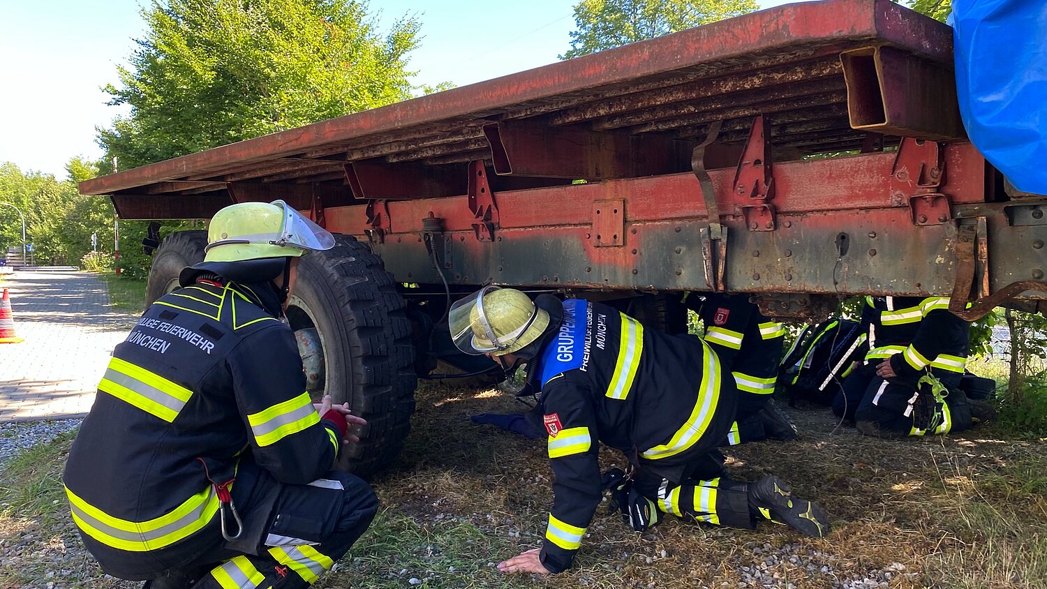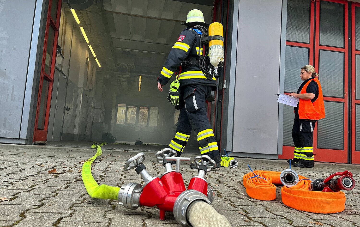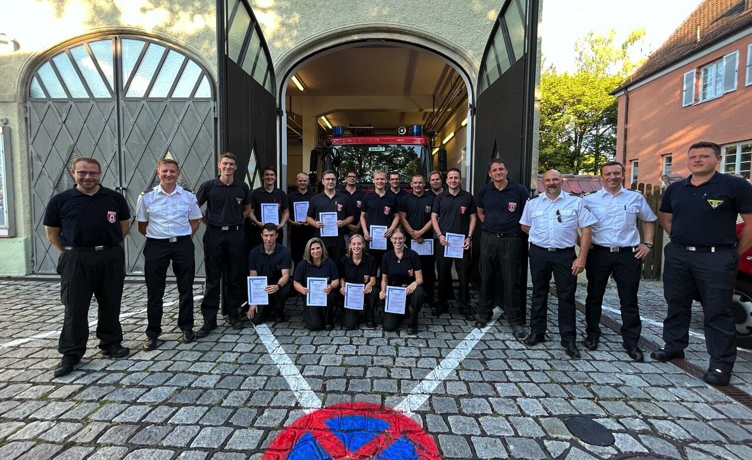 Den praktischen Lehrgangsabschluss bildete die Teilnahme an der Außenübung „Freistadt 2022“ der Feuerwehr München auf dem Übungsgelände der Staatlichen Feuerwehrschule Geretsried. Neben vielen Einzellagen wurden auch gemeinsame Zuglagen zusammen mit der Berufsfeuerwehr beübt, unter teils extrem heißen Witterungsbedingungen.