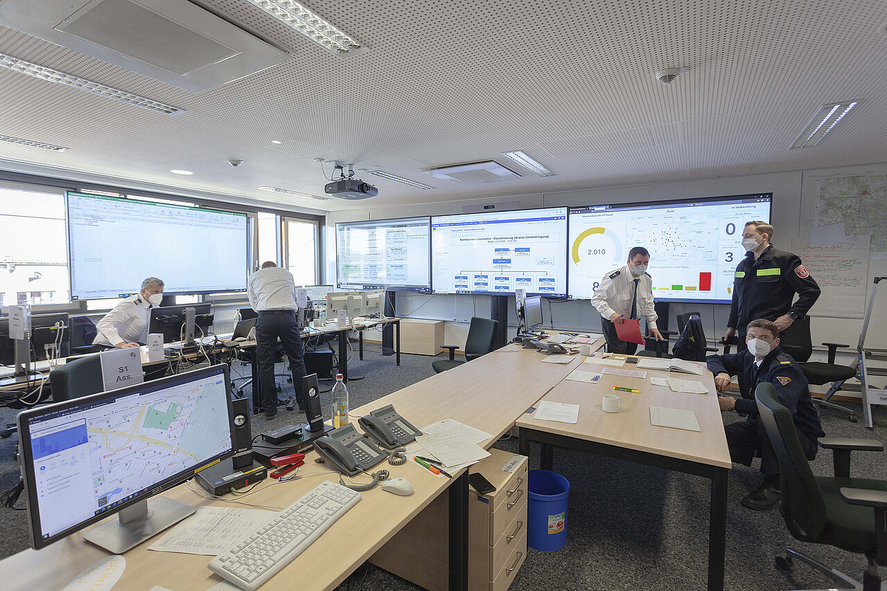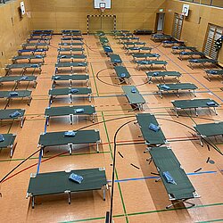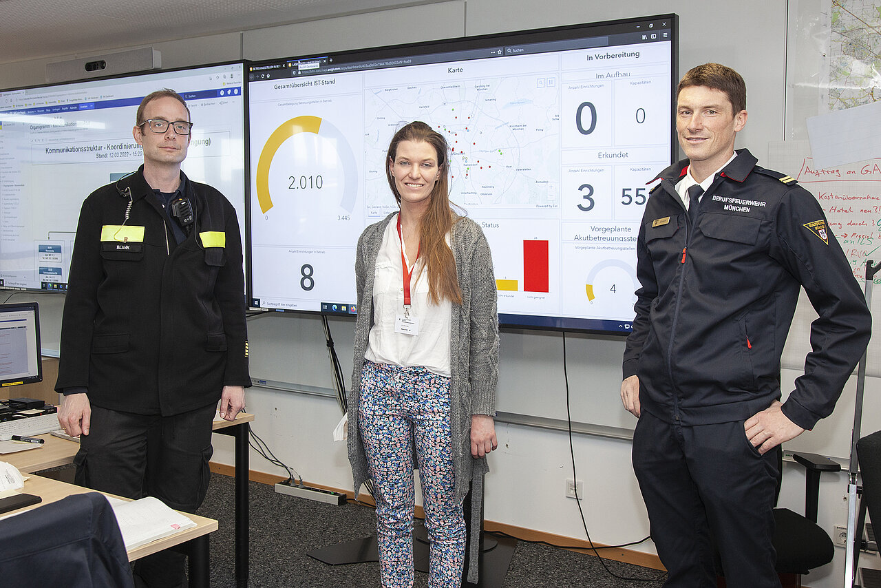 Zunächst unterstützten wir beim Aufbau von Akutbetreuungsstellen. Hierbei wurden Feldbetten aufgebaut und Infrastruktur in Betrieb genommen. Wir arbeiteten dabei Hand in Hand mit vielen freiwilligen Helferinnen und Helfern wie den Münchner Freiwilligen zusammen. Aufgrund der dynamische Lage mussten zeitgleich bereits Meldeköpfe an den Notunterkünften betrieben werden, die laufend Bettenanzahl und Auslastung für jede der ein dutzend Betreuungsstellen rückmeldeten.
