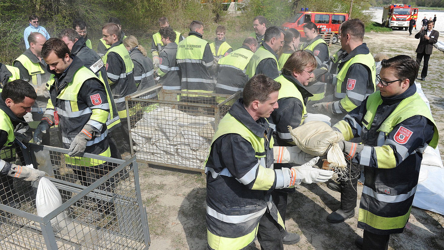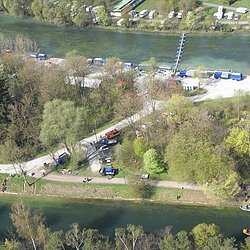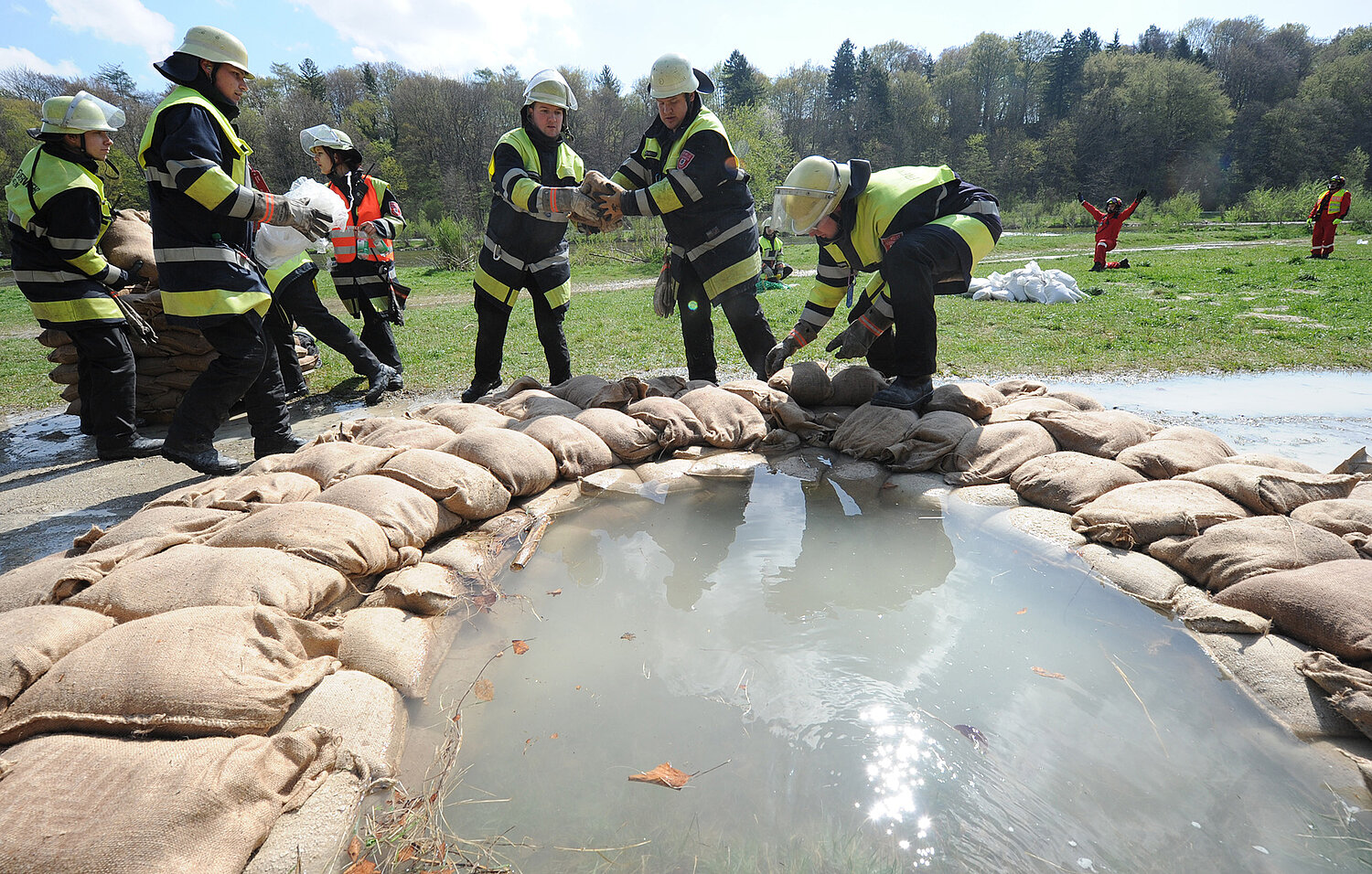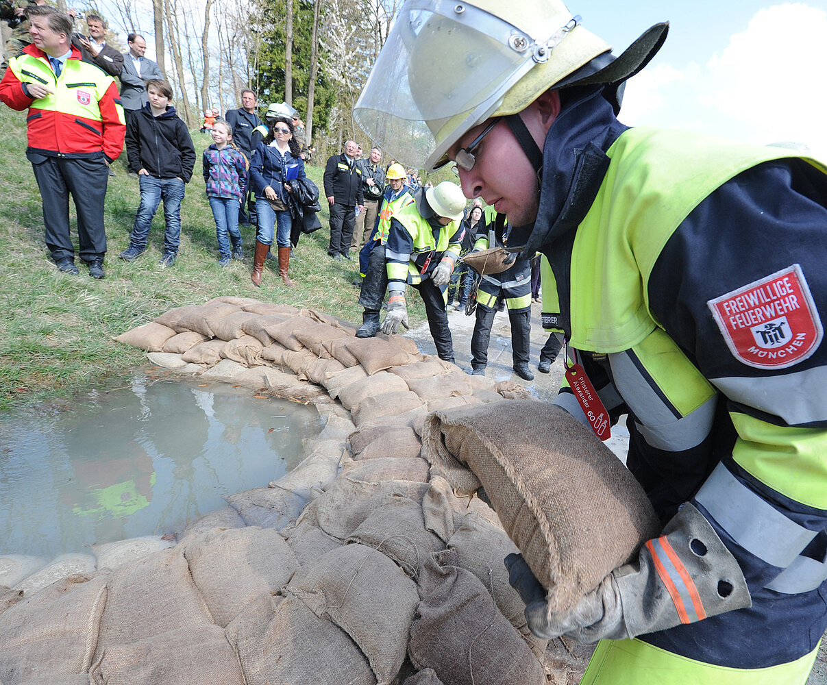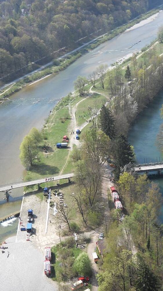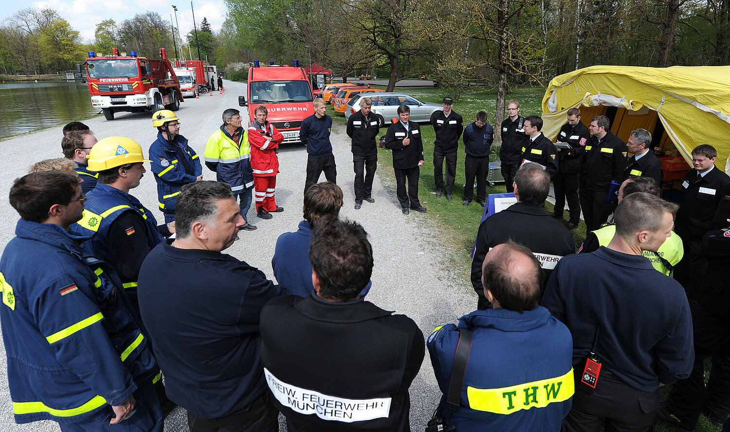 Am 16. April 2011 kurz nach 7 Uhr war es vorbei mit der Ruhe an der Floßlände im Münchner Süden. Mit dem Abladen der Sandfüllmaschinen sowie der Einrichtung einer sogenannten Örtlichen Einsatzleitung im Katastropheneinsatzleitfahrzeug (KELF) der Feuerwehr München, wurden letzte Übungsvorbereitungen getroffen.