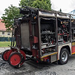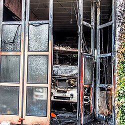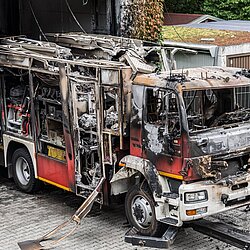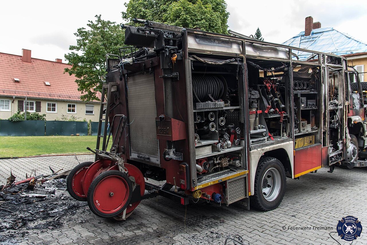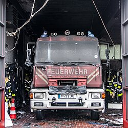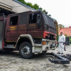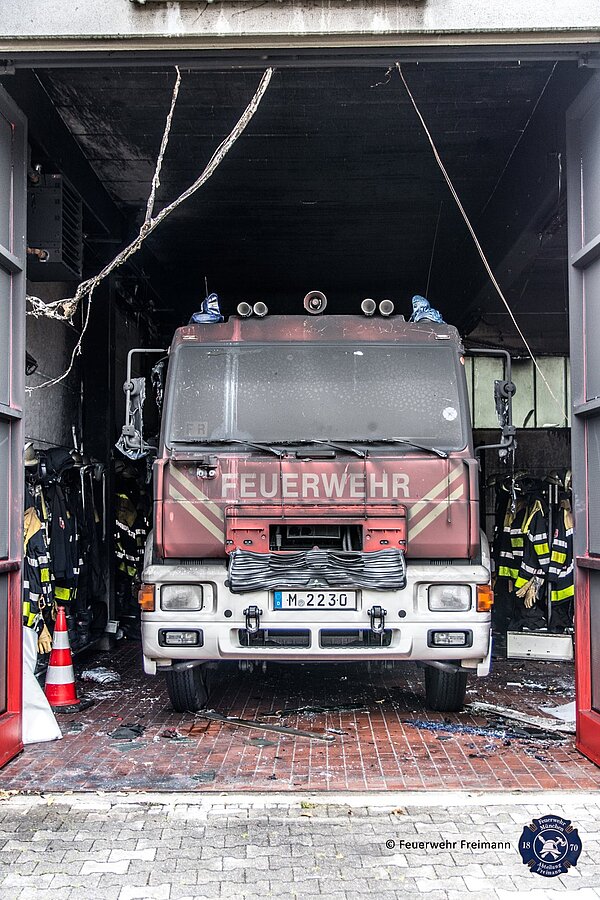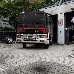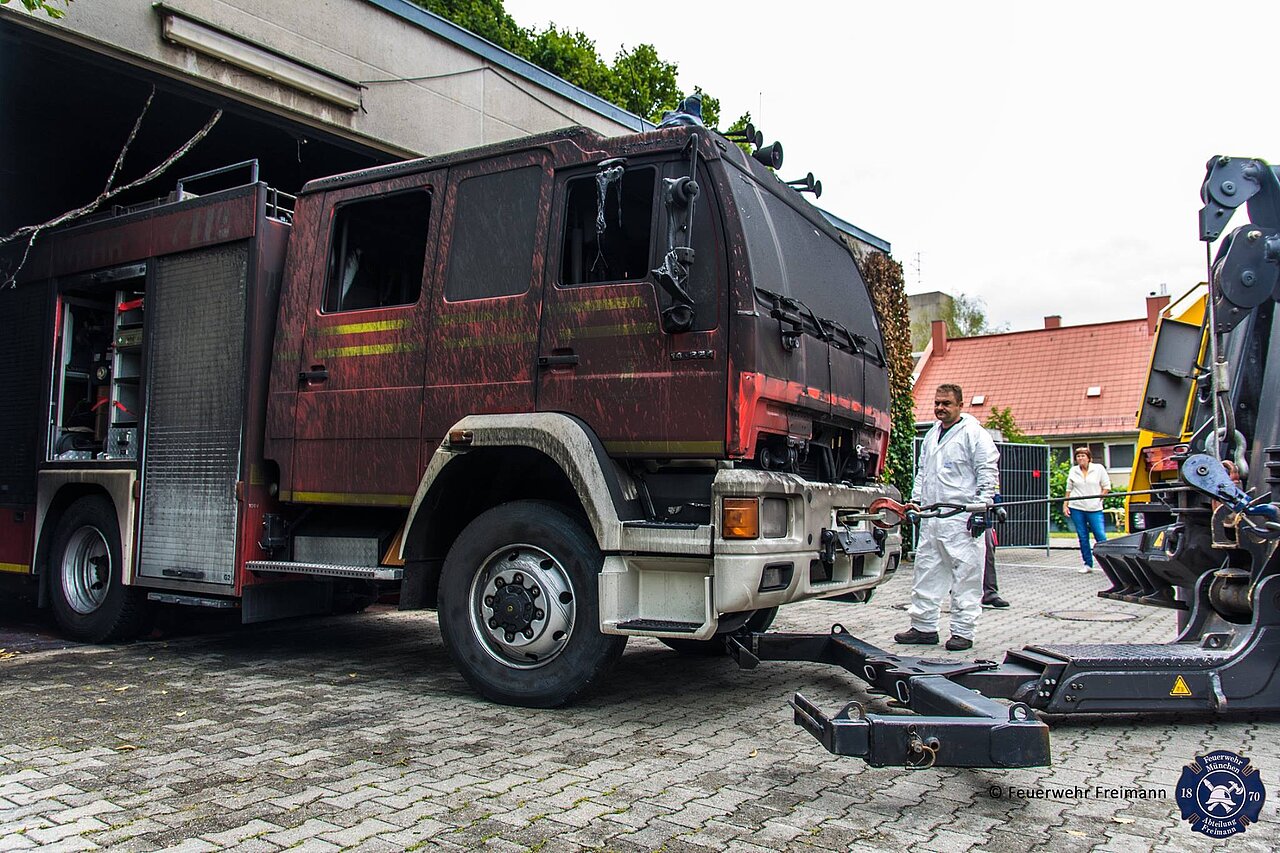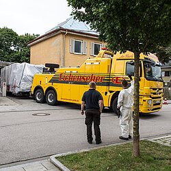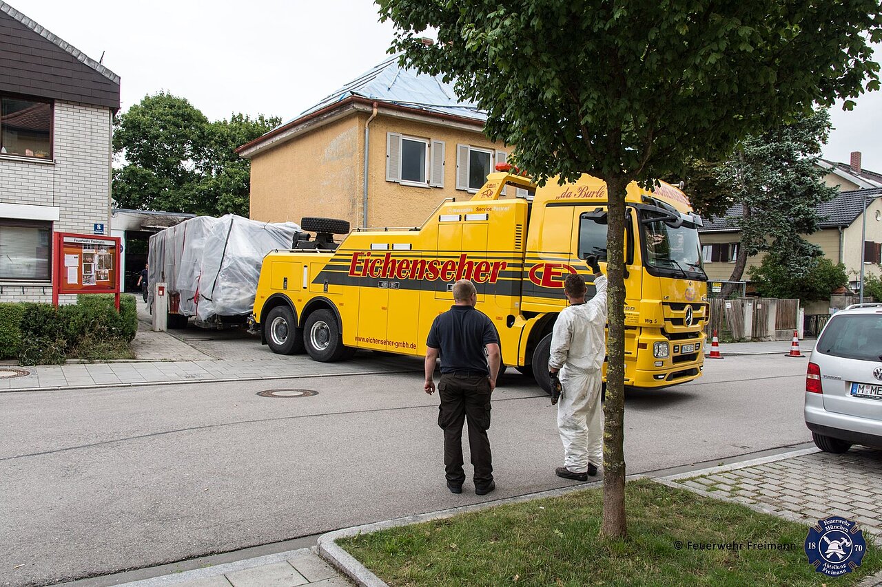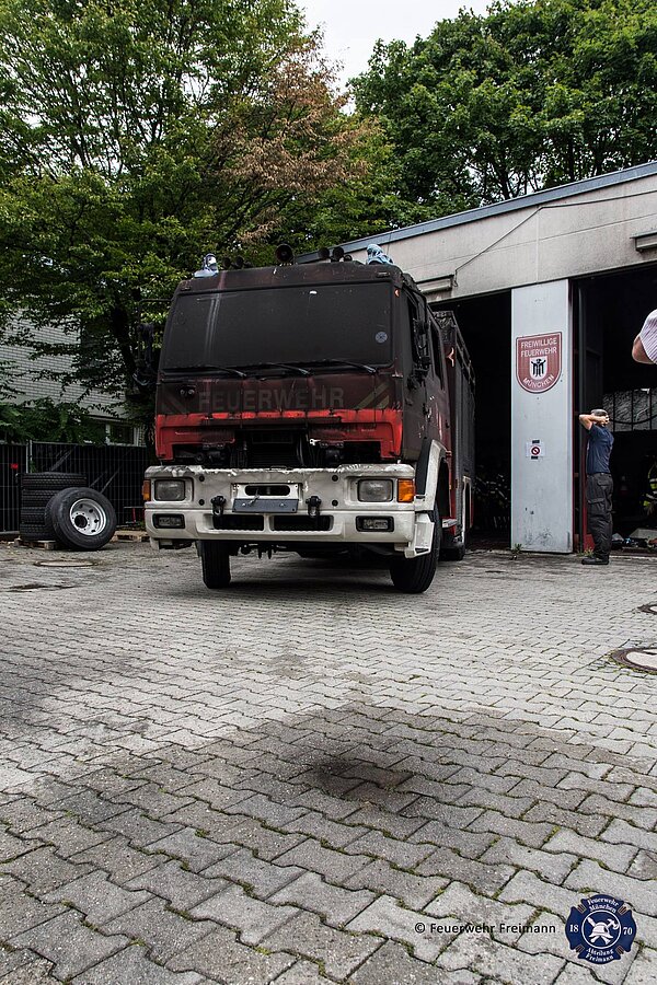 Damit Letzteres möglich war, mussten allerdings zunächst die Überreste der Fahrzeuge aus der Halle entfernt werden. Dies geschah in mehrstündiger Arbeit durch eine Fachfirma in Zusammenarbeit mit der Berufsfeuerwehr München und einigen Kräften der Abteilung Freimann. Das HLF der Abteilung wurde zur Absicherung der Abschleppgespanne in Richtung Feuerwache 9 eingesetzt. Mit Wehmut und Herzblut wurden damit die letzten Fahrten des LF 16/12 und des TLF 16/25 mit VSA, die uns über Jahre hinweg stets zuverlässig unterstützt haben, begleitet.