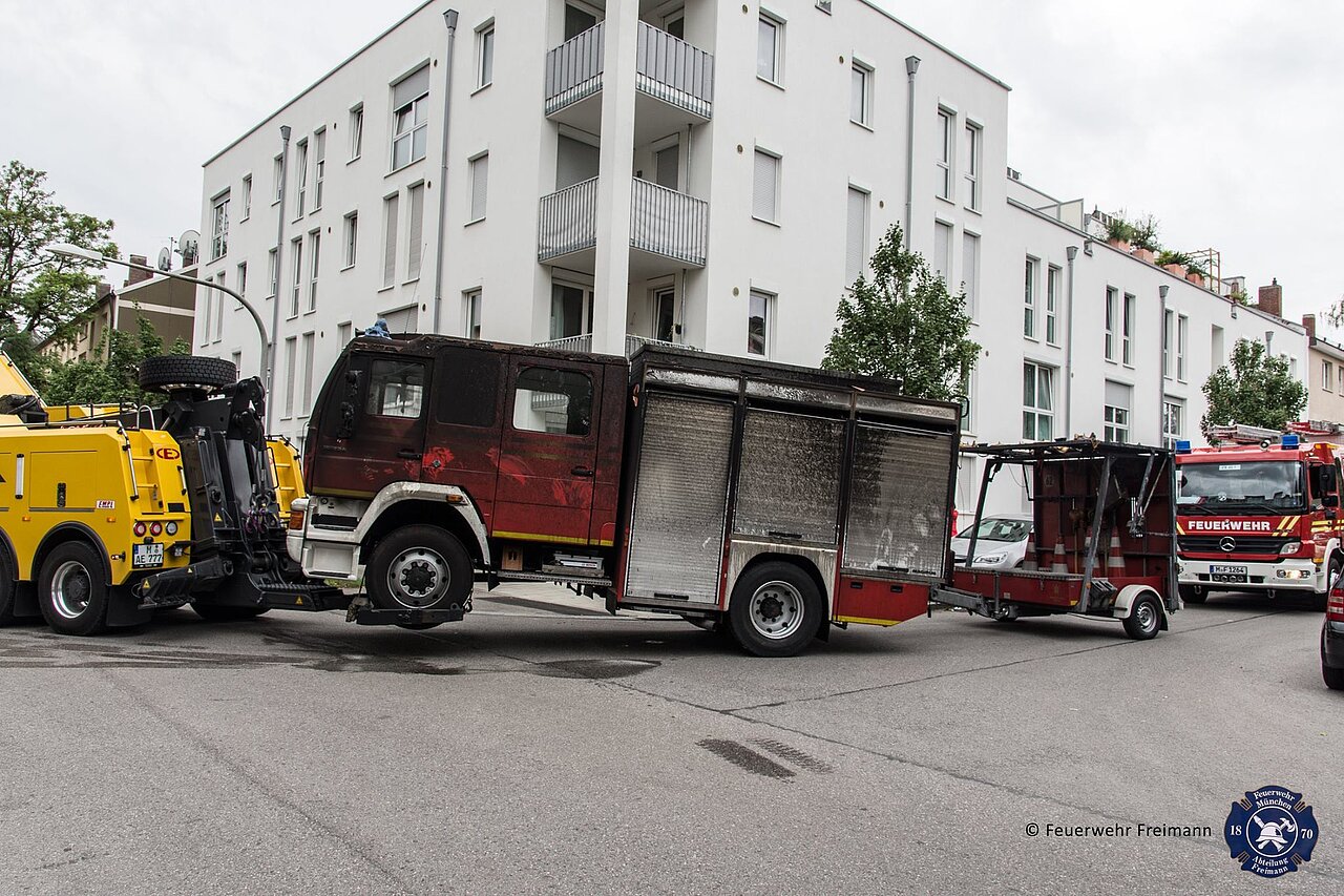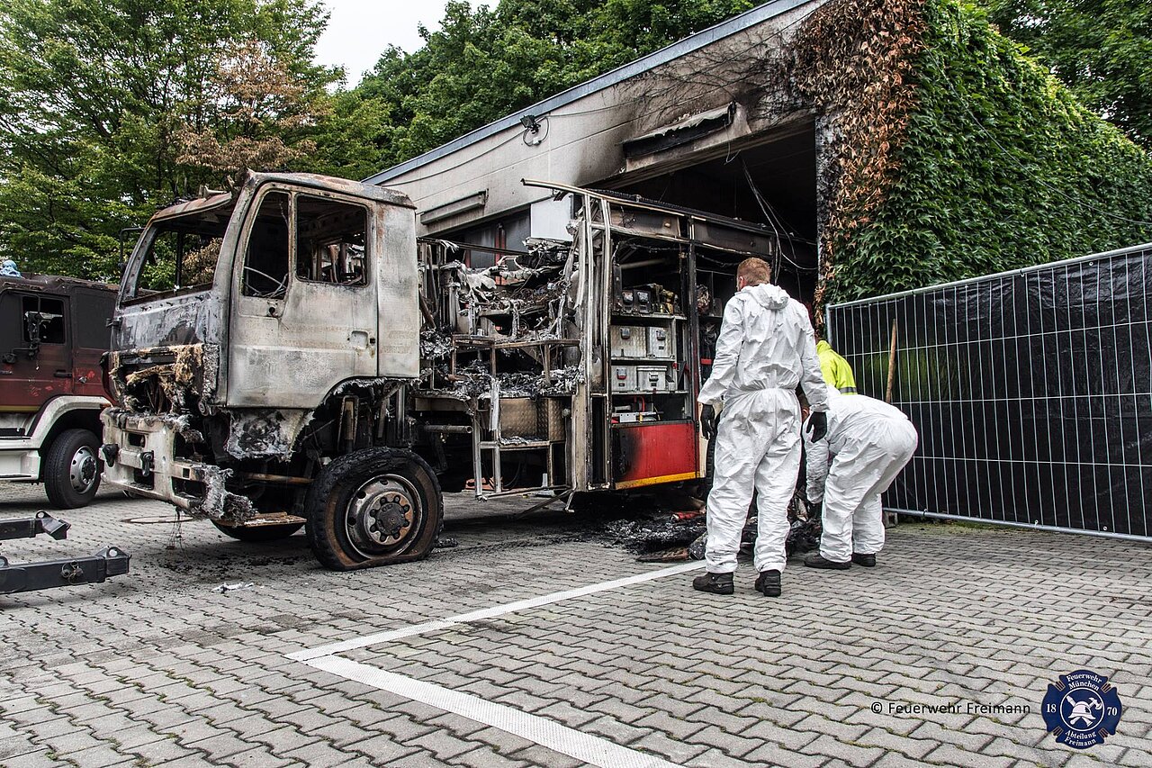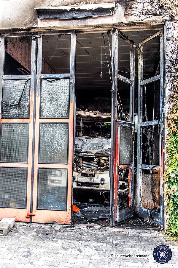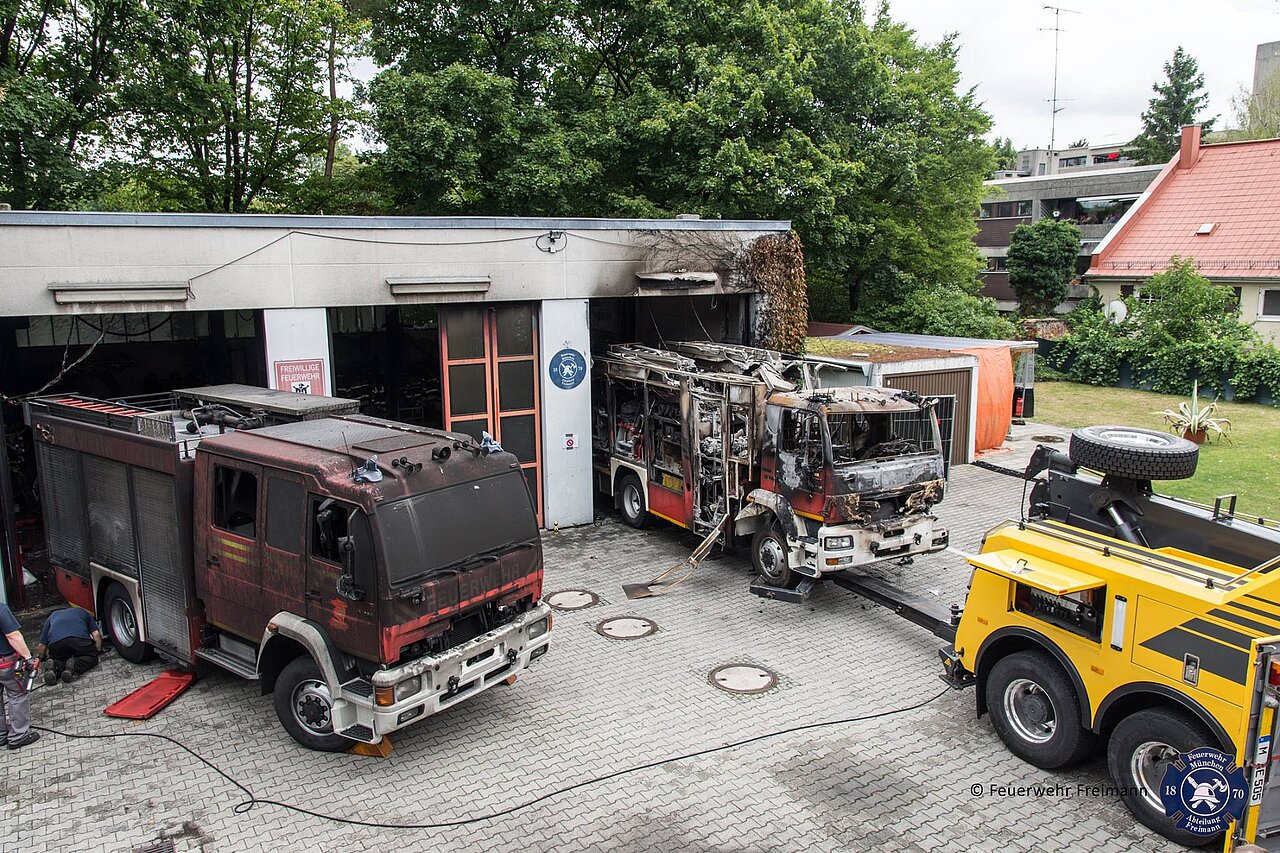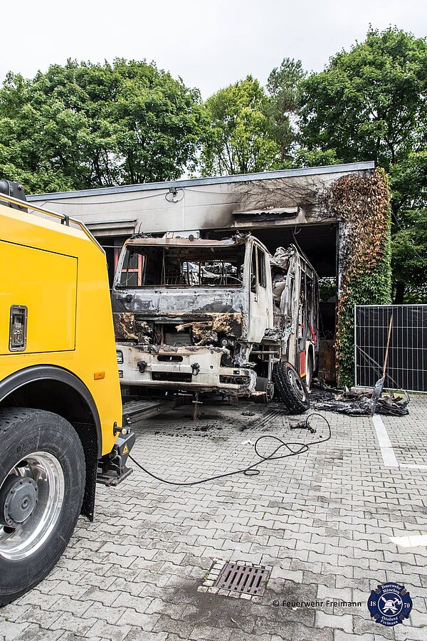 Im Notbetrieb bereits wieder einsatzbereit, wurden in Freimann die ausgebrannten Fahrzeuge abgeschleppt und die einsturzgefährdete Fahrzeughalle abgestützt.