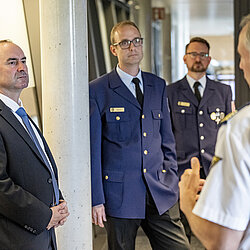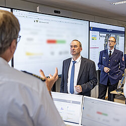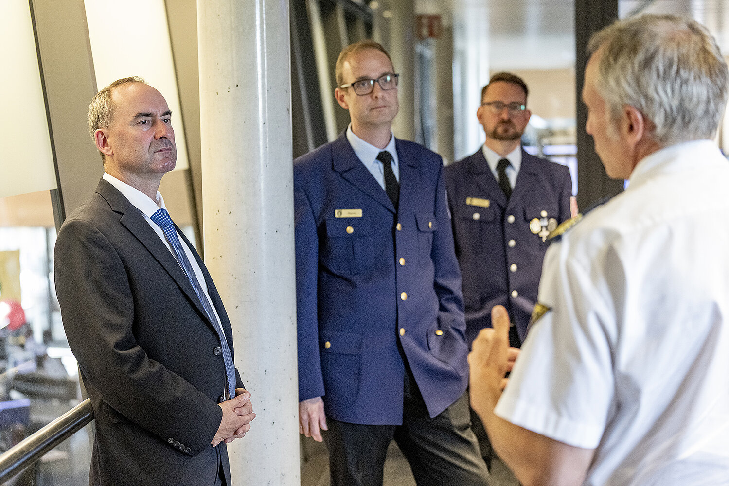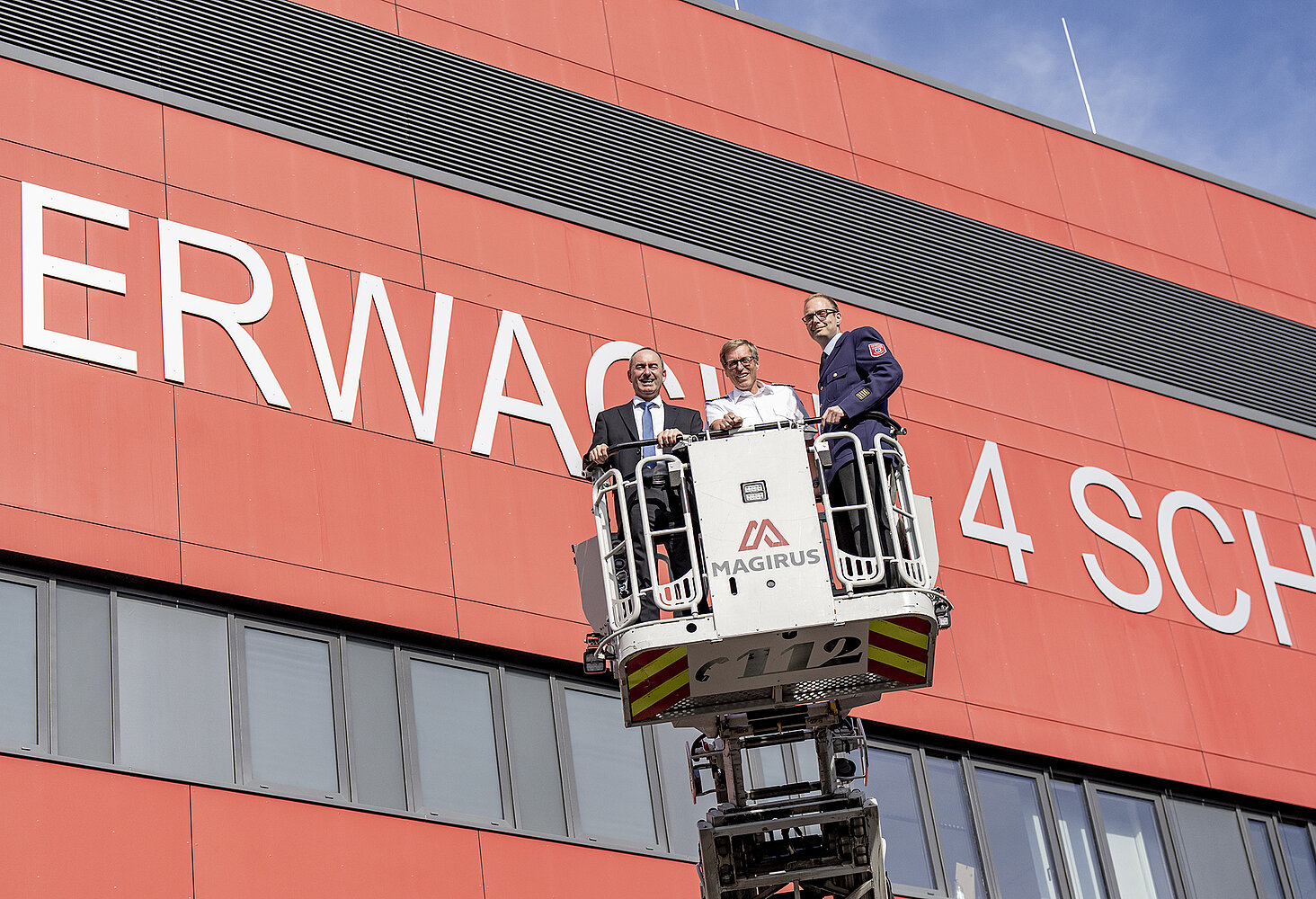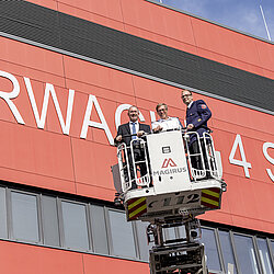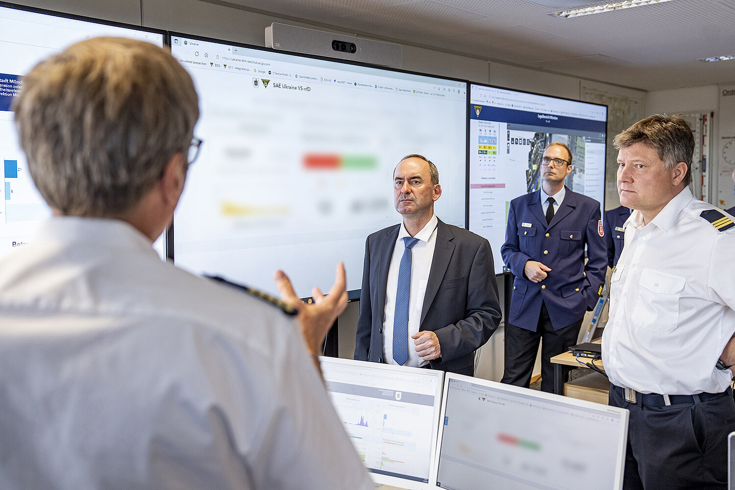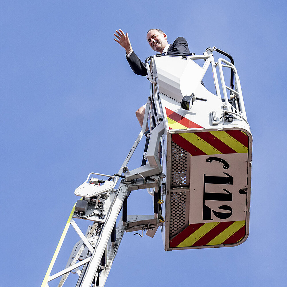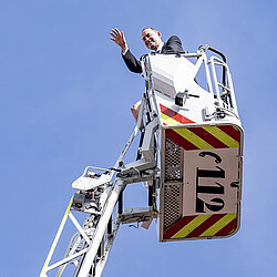 Herr Aiwanger besichtigte anschließend noch die Feuerwache 4 mit der Integrierten Leitstelle und konnte sich auch hier einen Einblick über die Arbeit der Feuerwehr München verschaffen. Eine Fahrt mit der Drehleiter mit Blick auf die fertig aufgebaute Wiesn rundete den Besuch ab.