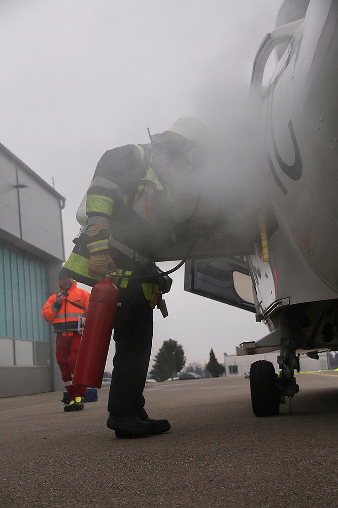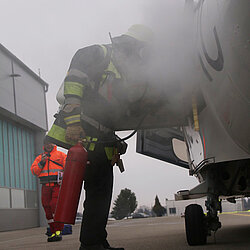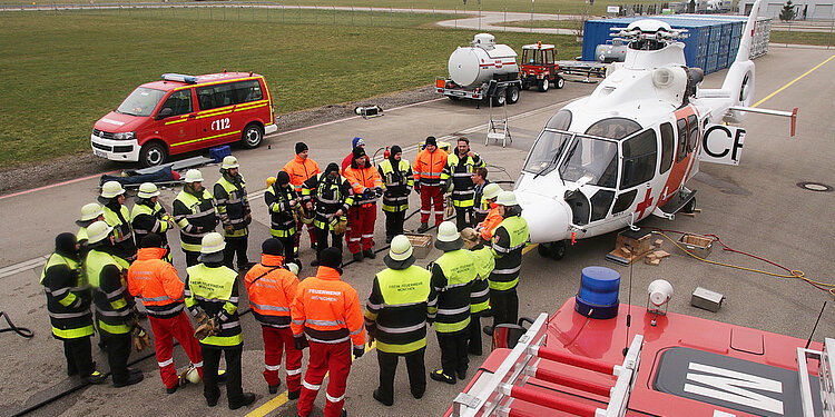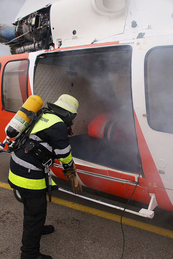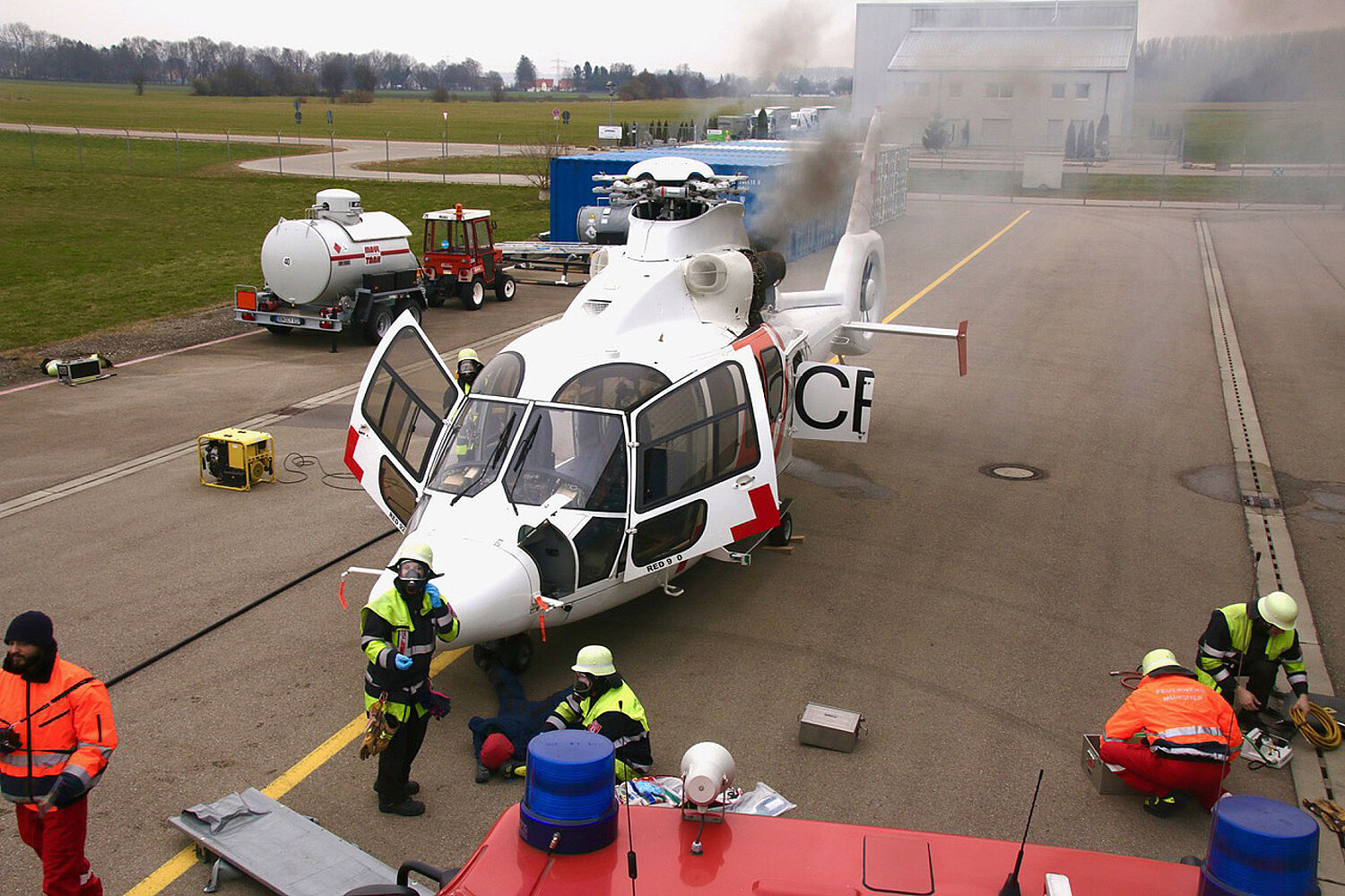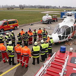 Am Augsburger Flughafen übten 25 Ehrenamtliche der FF München den Einsatz bei technischen Problemen und Unfällen mit Hubschraubern.