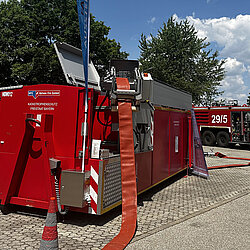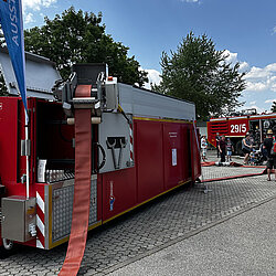 Darüber hinaus waren wir im Rahmen einer Fahrzeugausstellung mit mehren Fahrzeugen vor Ort. Darunter das Wechselladerfahrzeug mit dem Abrollbehälter Wasserfördersystem Bayern und ein Hilfeleistungslöschfahrzeug.