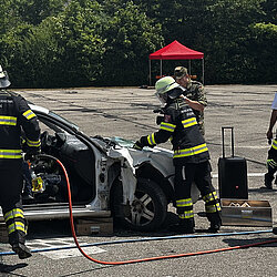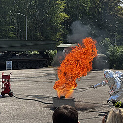 Als Teil der „Blaulicht-Meile“ gemeinsam mit Bundeswehr-Feuerwehr, THW und Feldjäger konnten Besucherinnen und Besucher Vorführungen mit unseren Kollegen wie eine Fettexplosion und die technische Rettung nach einem Verkehrsunfall erleben.