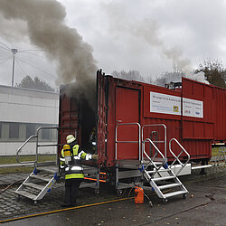 „Für uns ist es besonders wichtig, dass alle unsere Feuerwehrfrauen und Feuerwehrmänner im Umgang mit Atemschutzgeräten geschult sind. Für unsere Arbeit in München sehen wir das als essentiell an“ so Christof Reithinger, Stadtbrandmeister und Ausbildungsleiter bei der FF München und ergänzt: „im bayerischen Durchschnitt sind es deutlich weniger, da sind es ungefähr 25 Prozent – für unsere Aufgaben in einer Großstadt wie München wären das eindeutig zu wenige. Vor allem die Atemschutzunfälle aus jüngerer Vergangenheit zeigen, wie wichtig eine solide und umfassende Ausbildung auf diesem Gebiet ist. Die Möglichkeit hier im Brandübungscontainer ermöglicht, Extremsituationen realistisch darzustellen und so die Kameraden auf zukünftige Einsatzereignisse vorzubereiten. Sie können dadurch in der entsprechenden Situation instinktiv die richtigen Entscheidungen treffen.“