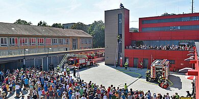| Bei strahlendem Sonnenschein öffnete die neue Feuerwache 4 und das Gerätehaus der Abteilung Stadtmitte am Samstag, den 10. September ihre Tore. Rund 10.000 Besucher strömten auf das neue Gelände in die Heßstraße 120.