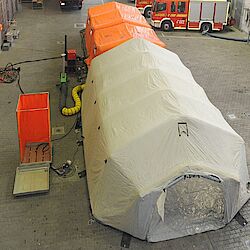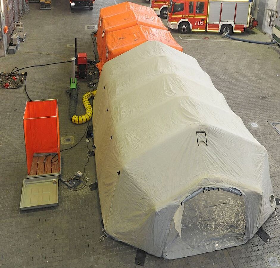Dieser Zentralachsanhänger ergänzt mit seiner Beladung den Dekontaminationsplatz des Bundes um Equipment, mit dessen Hilfe der Platz auch zur Versorgung von nicht gehfähigen Personen verwendet werden kann. Der Anhänger ist dem GW-Dekon P als Zugfahrzeug zugeordnet.