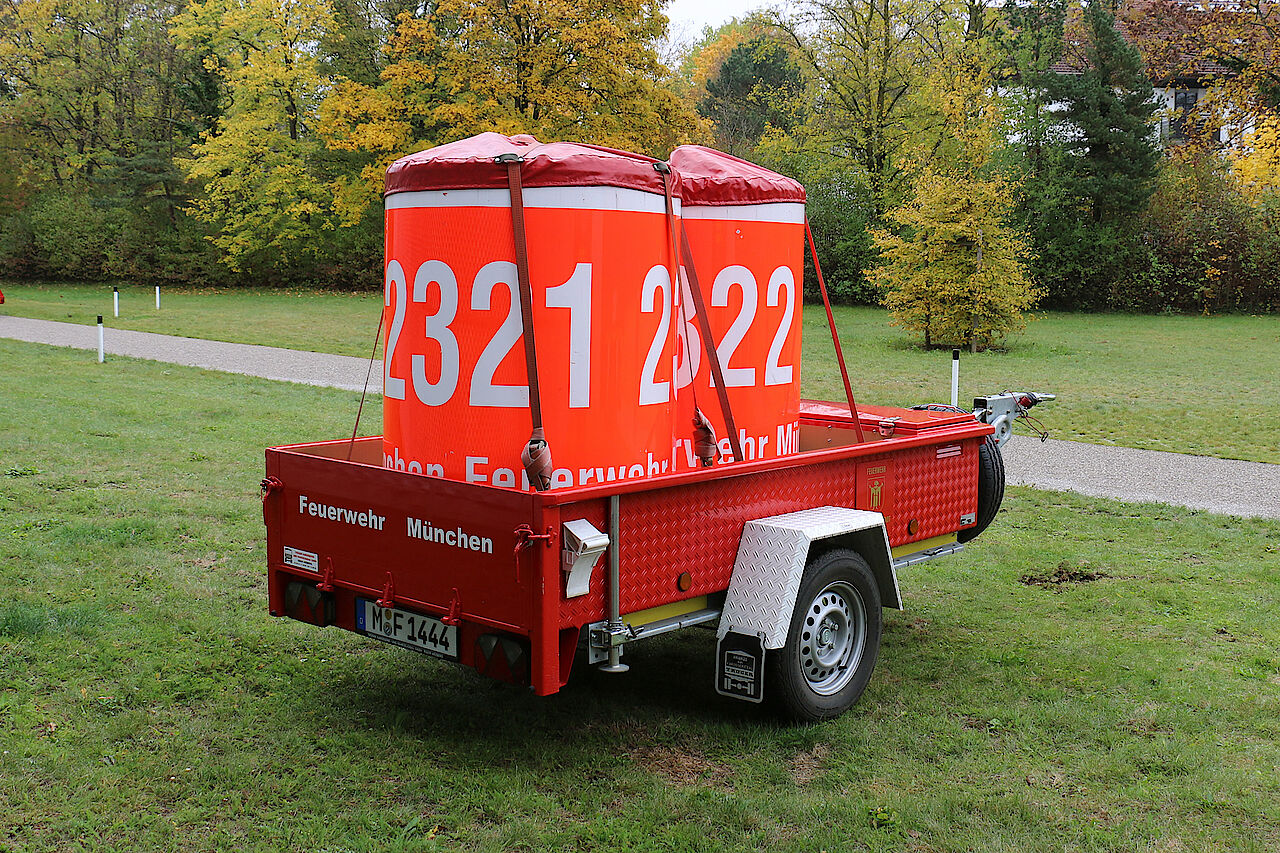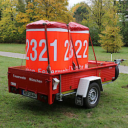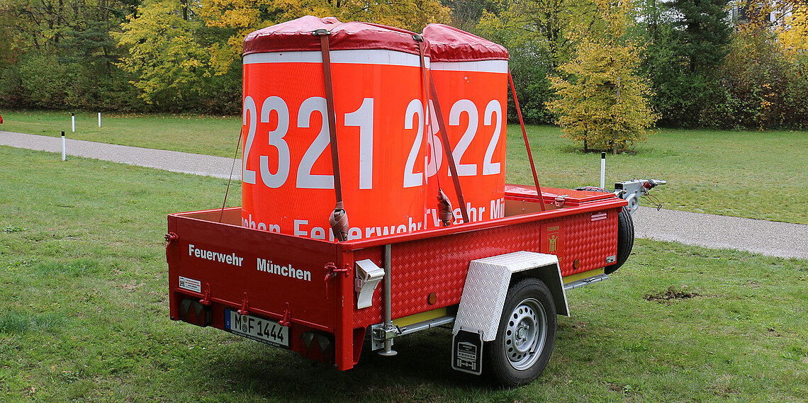 Auf einem Anhänger werden zwei Löschwasserbehälter Semat F 900 mit jeweils 900 Litern Fassungsvermögen transportiert.