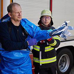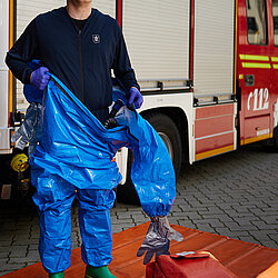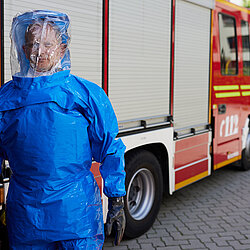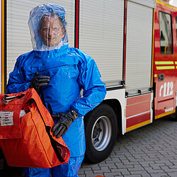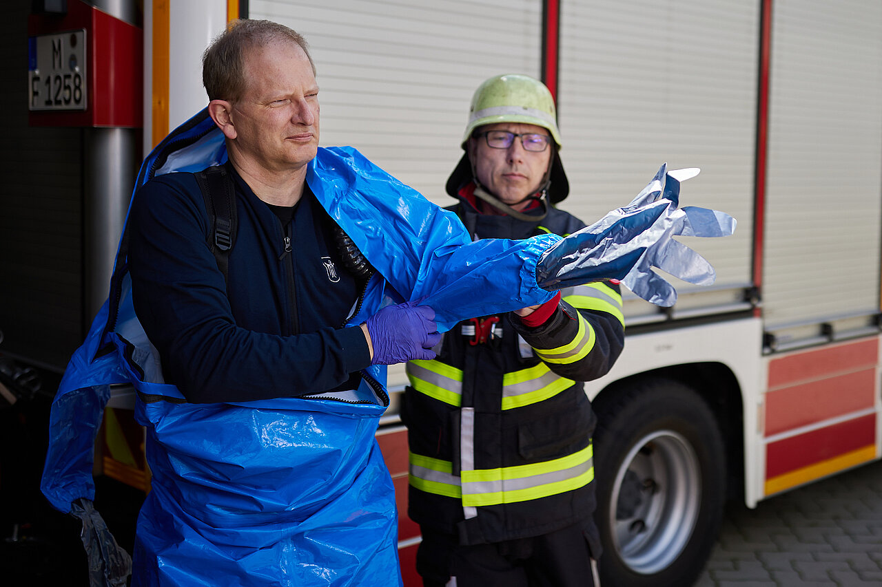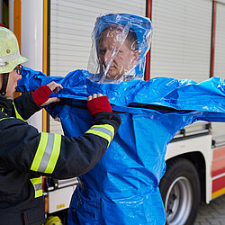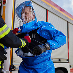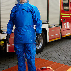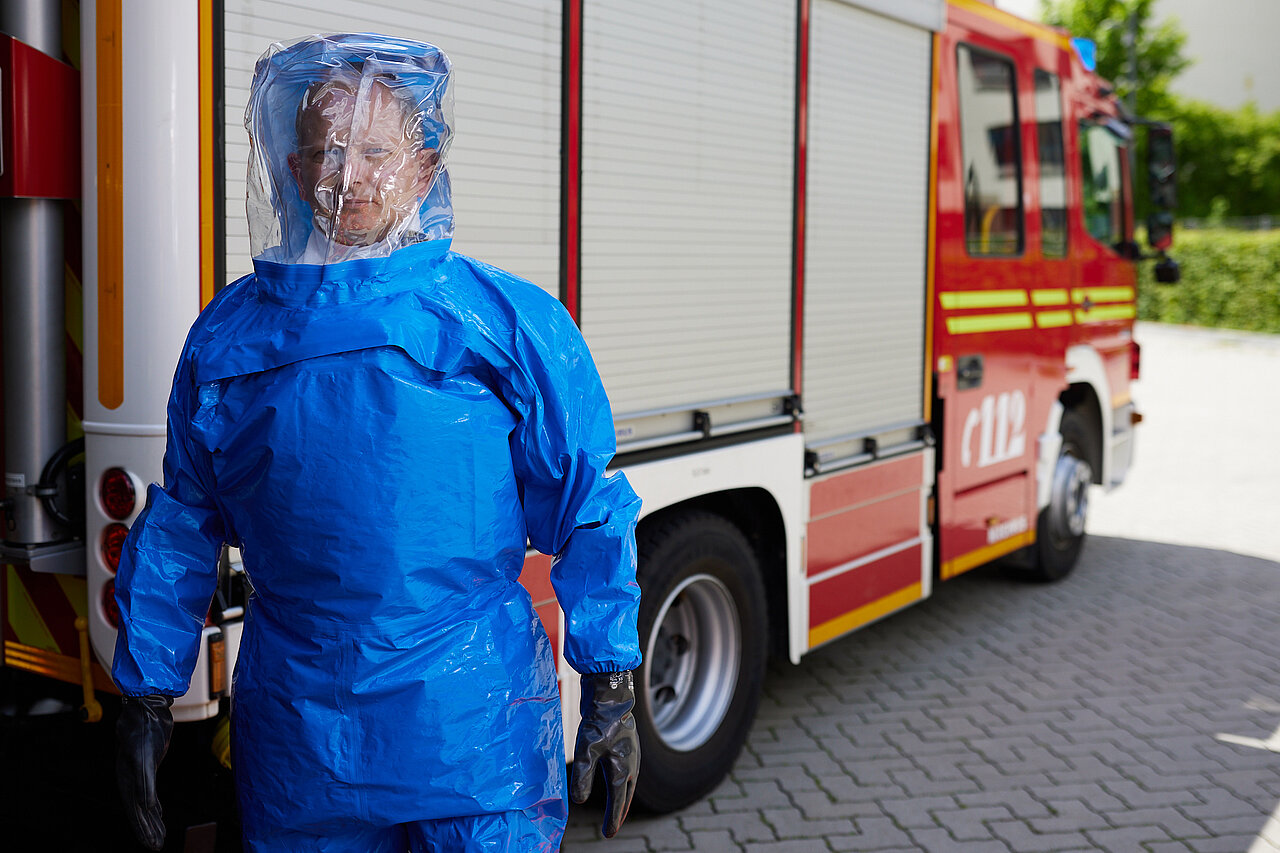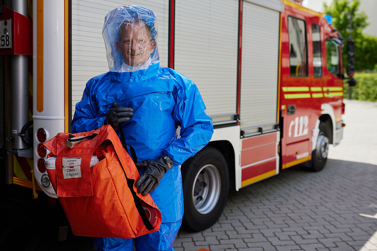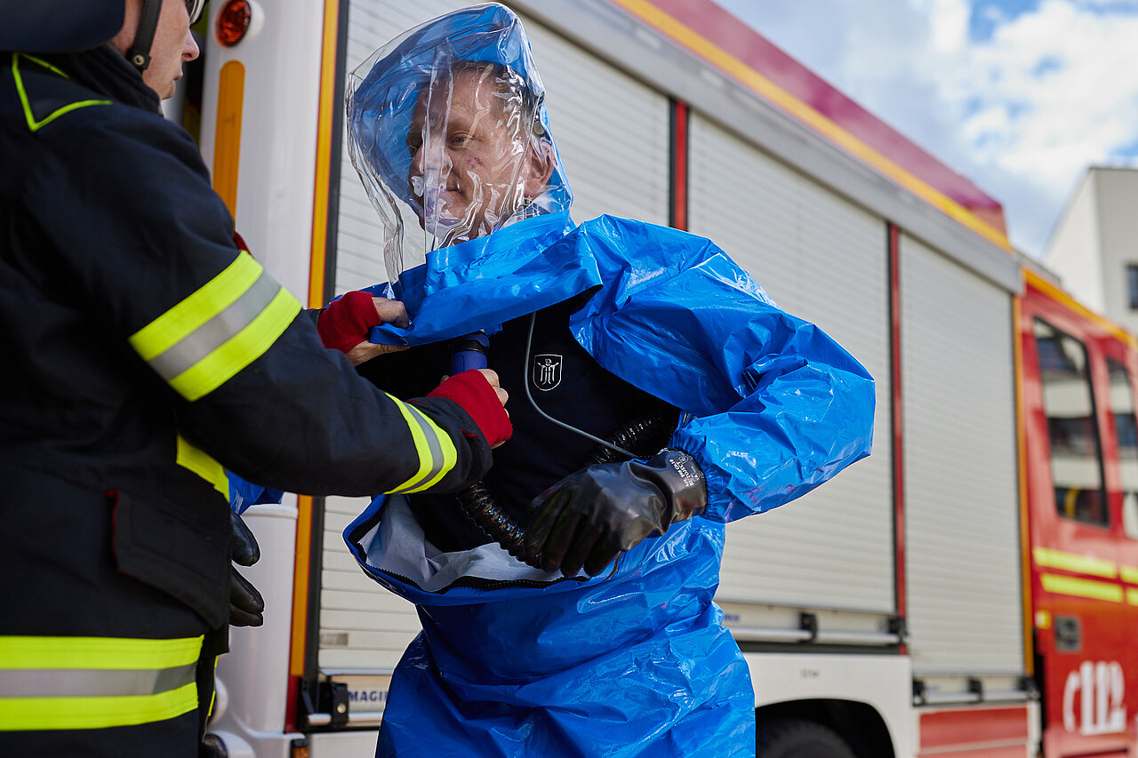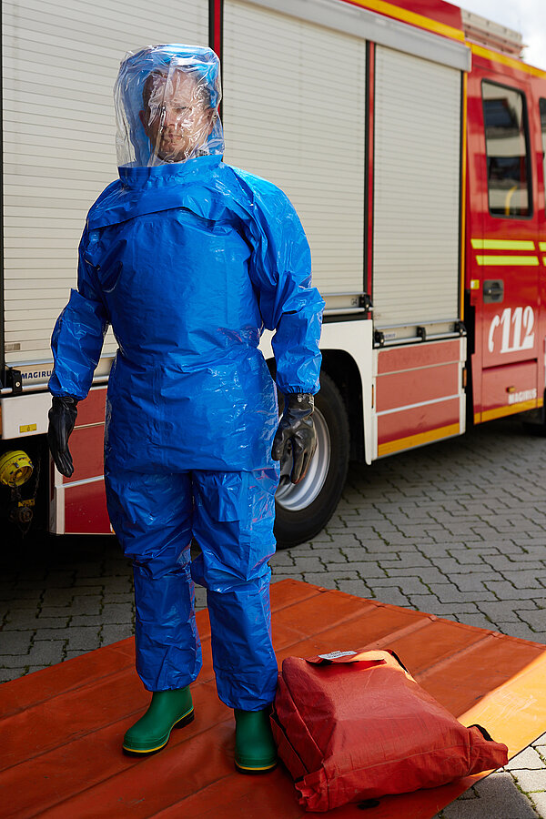 Der vom Freistaat Bayern beschaffte Gebläseanzug wird eingesetzt bei der Dekontamination von Verletzten im Nassbereich, zum Schutz von medizinischem Personal in kontaminierten Bereichen sowie bei der Probenahme und der Feldanalyse der Analytischen Taskforce.