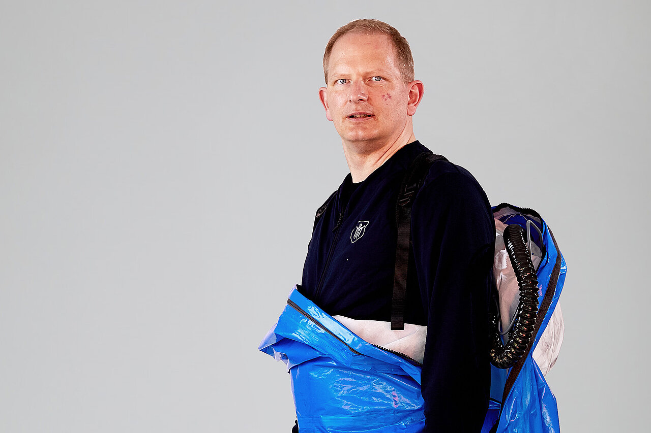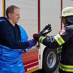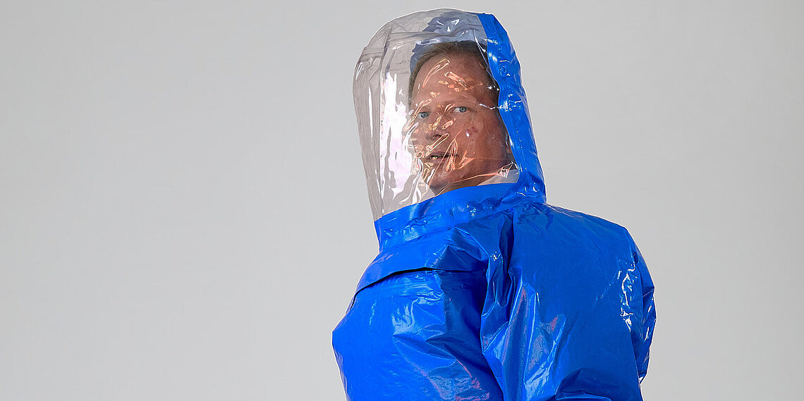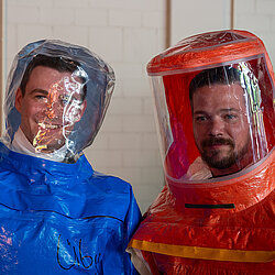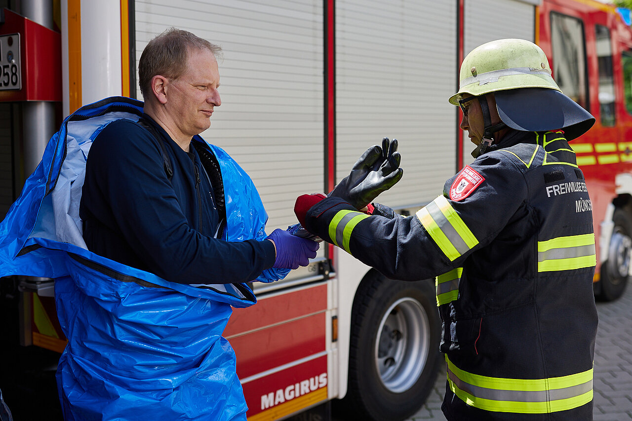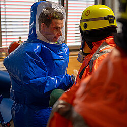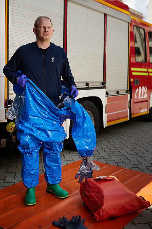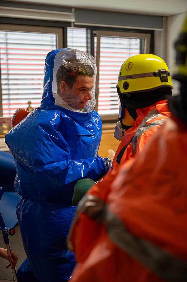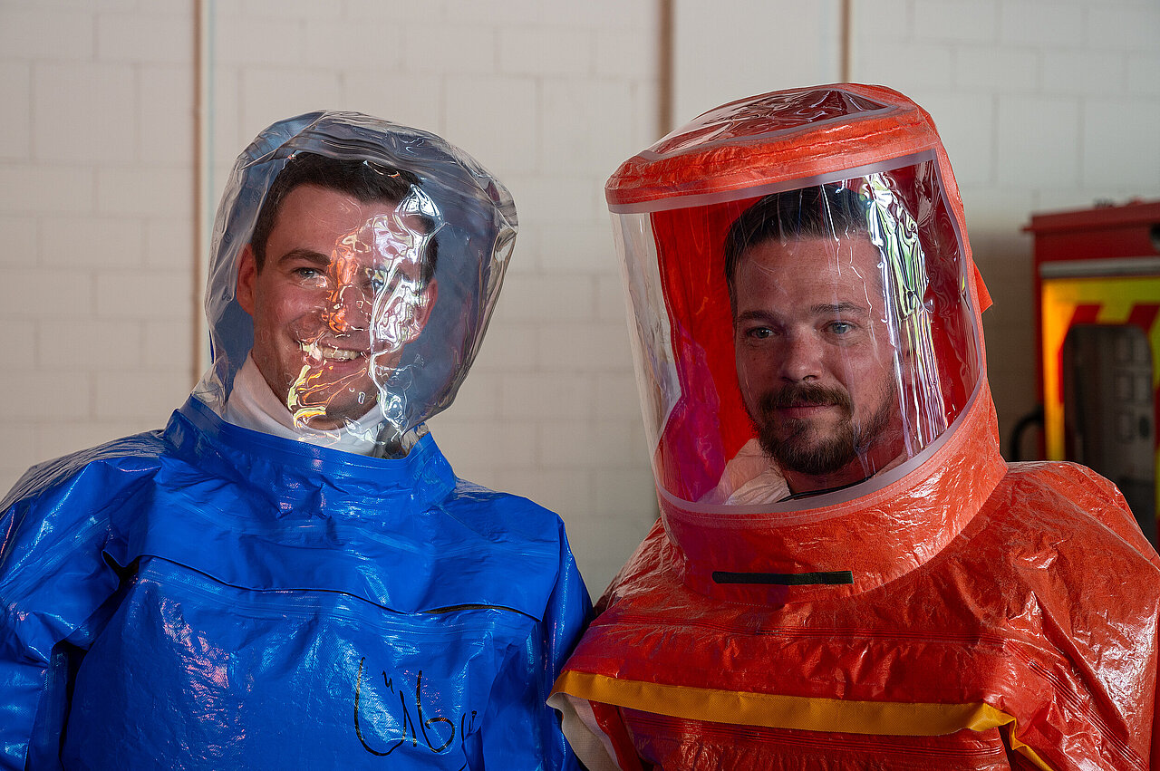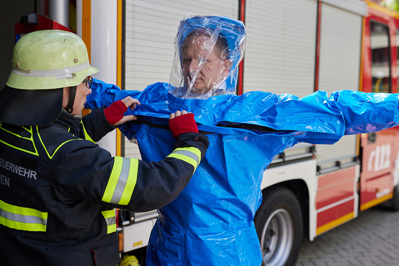 Der vom Freistaat Bayern beschaffte Gebläseanzug wird eingesetzt bei der Dekontamination von Verletzten im Nassbereich, zum Schutz von medizinischem Personal in kontaminierten Bereichen sowie bei der Probenahme und der Feldanalyse der Analytischen Taskforce.