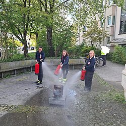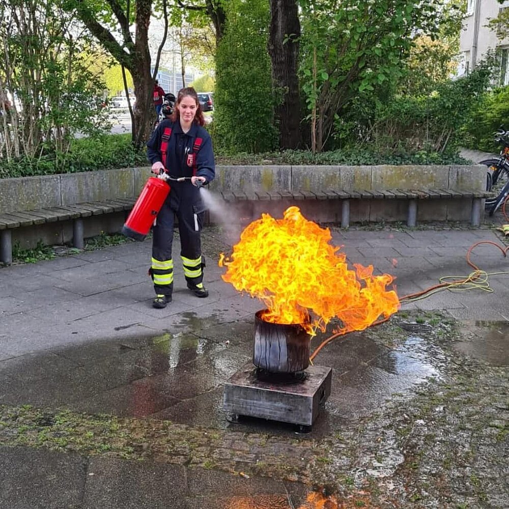 Für alle Interessierten wurde von Melissa, Nina, Rebecca und Veronika ein Vortrag und eine praktische Löschübung direkt vor Ort bei der Moosacher Stadtbibliothek durchgeführt.