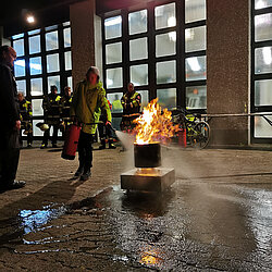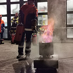 Anhand einer abschließenden „Fettexplosion“ verdeutlichten die Ausbilder, welche Gefahr von brennendem Fett ausgeht, wenn dieses mit Wasser gelöscht wird.