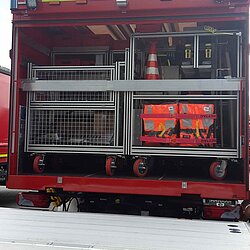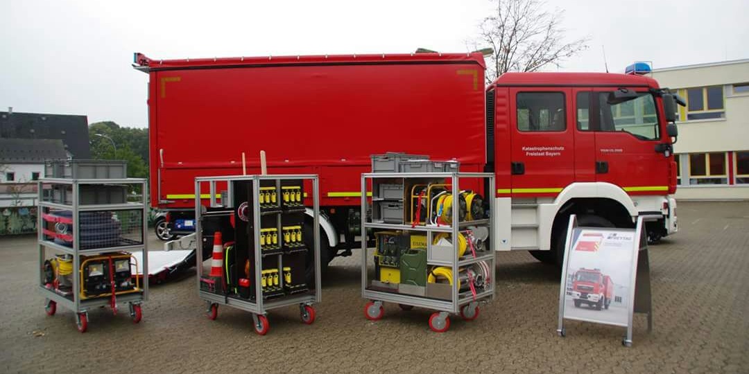 Daraus ergibt sich eine Pumpenleistung von ca. 35.000 l/min. Im jeweiligen Gerätesatz sind zudem noch 3 Stromerzeuger mit 13 kVA vorhanden. Ebenso das gesamte Zubehör und Equipment, um mit jedem Rollcontainer eigenständig arbeiten zu können.