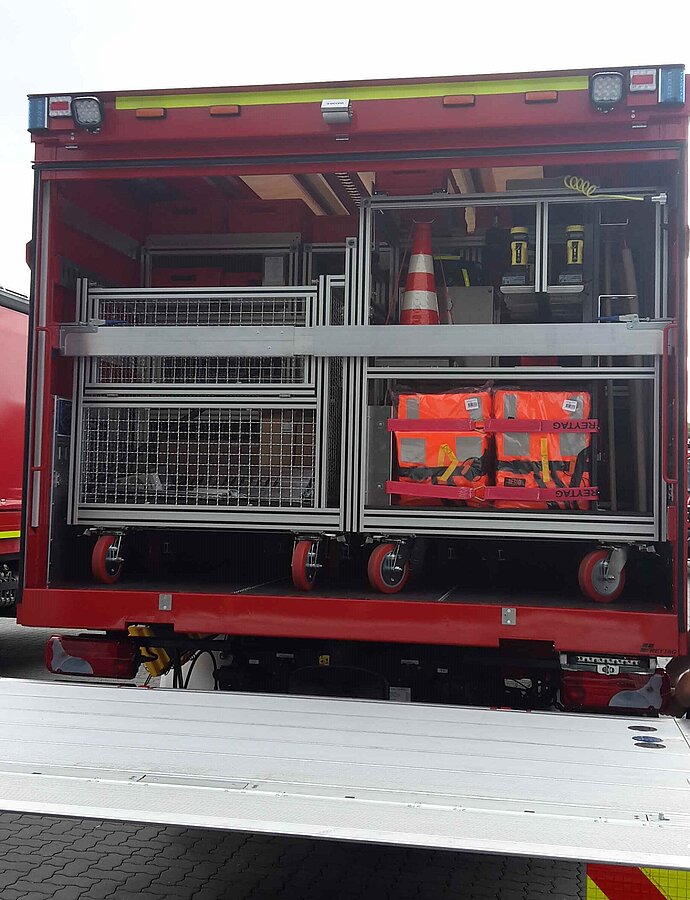 Der Gerätesatz Hochwasser besteht im Wesentlichen aus 11 Rollcontainern, auf denen insgesamt 12 Chiemsee-B-Pumpen und 6 Minichiemsee-B-Pumpen mit Schläuchen, Armaturen, Lichttechnik und diverser feuerwehrtechnischer Beladung verlastet sind.