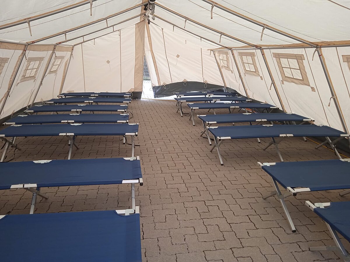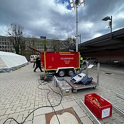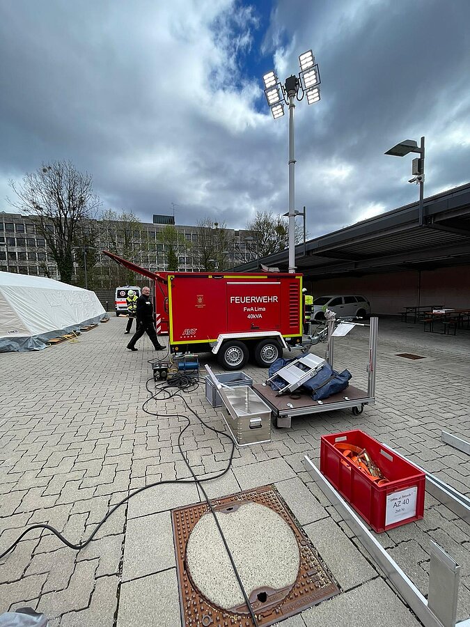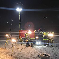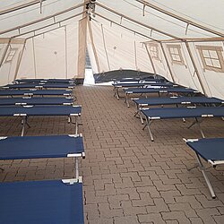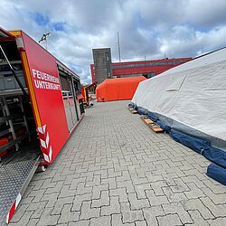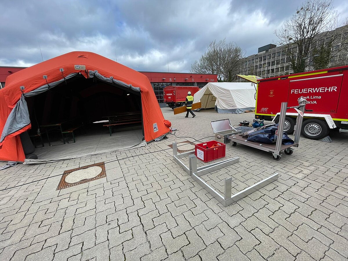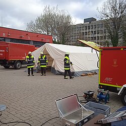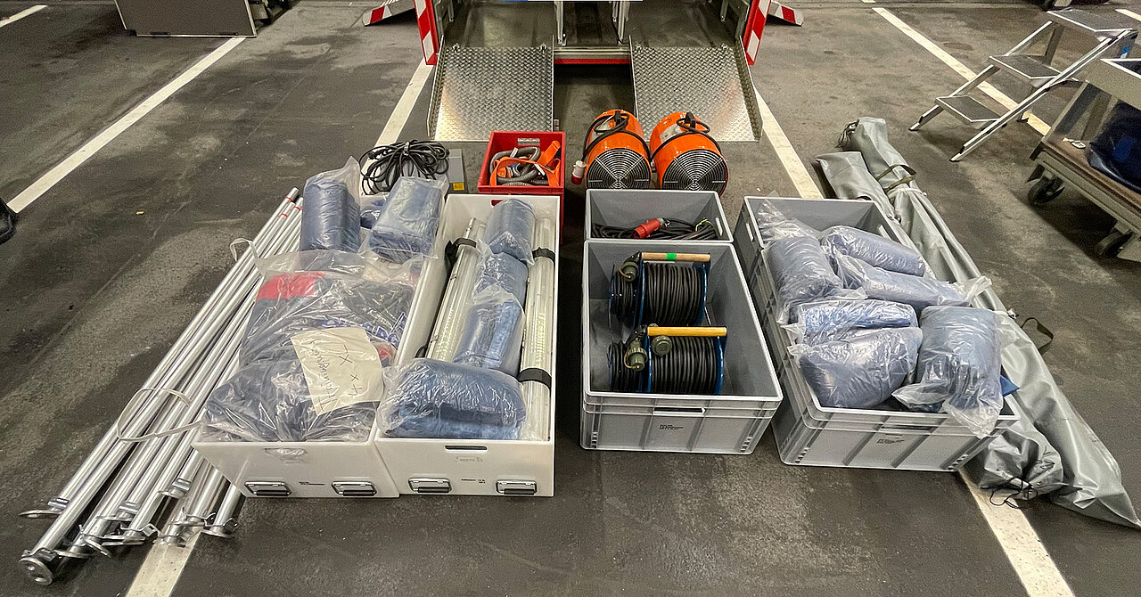 Der AB Unterkunft enthält unter anderem Zelte, Biertischgarnituren, Feldbetten, Heizung uvm. Der AB Dekon-Z dient als Sanitärbereich mit Duschen für Betroffene und Einsatzkräfte. Der Lichtmast-Anhänger schafft Licht und Sicherheit bei Dunkelheit im Bereich der Unterkunft.