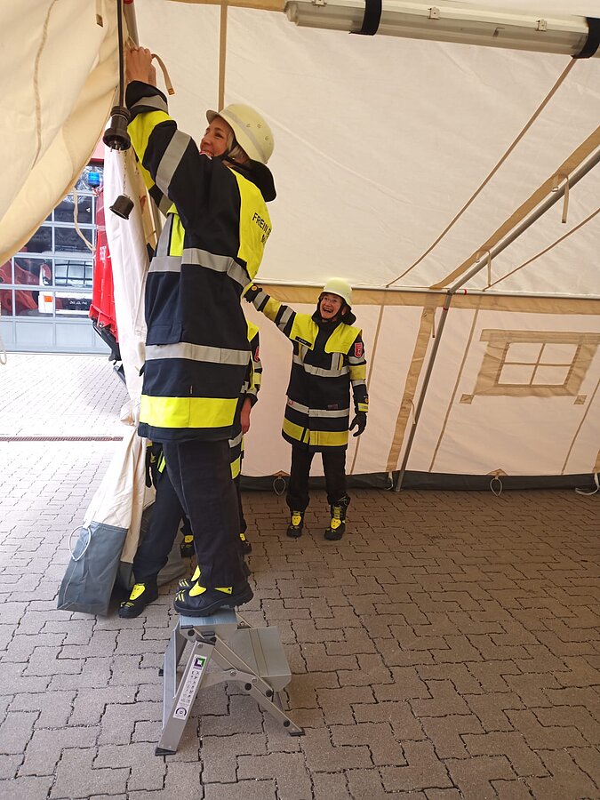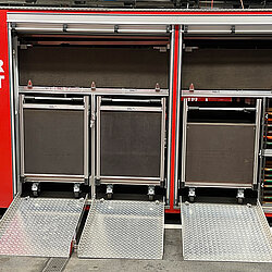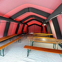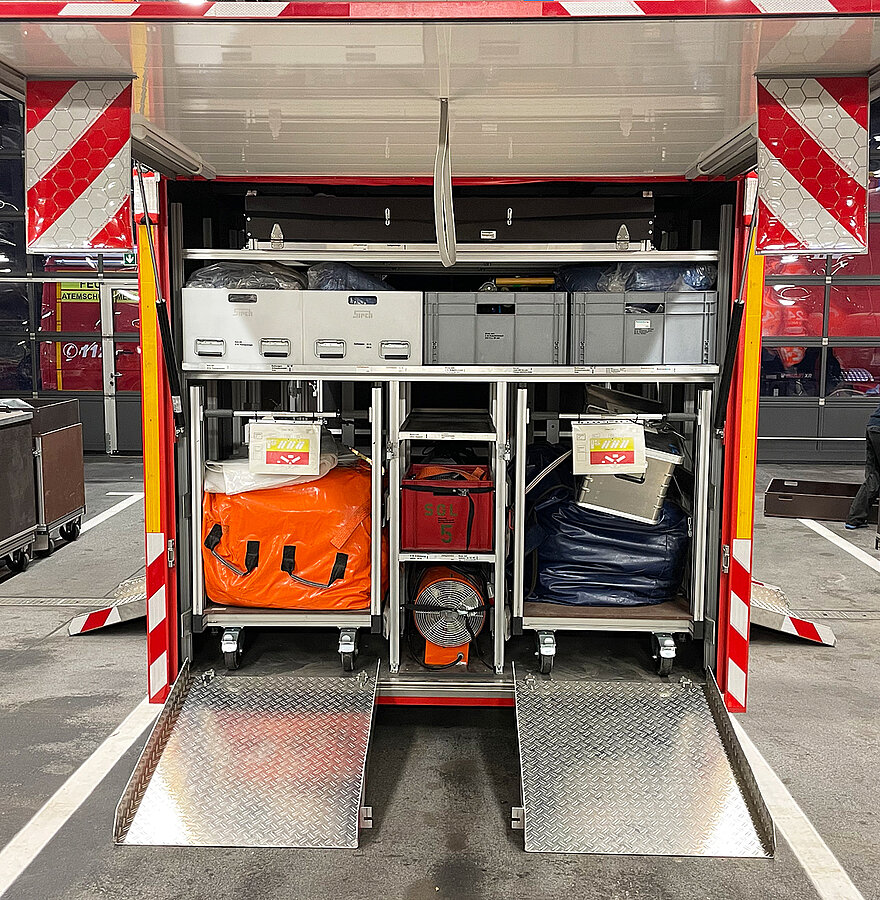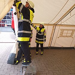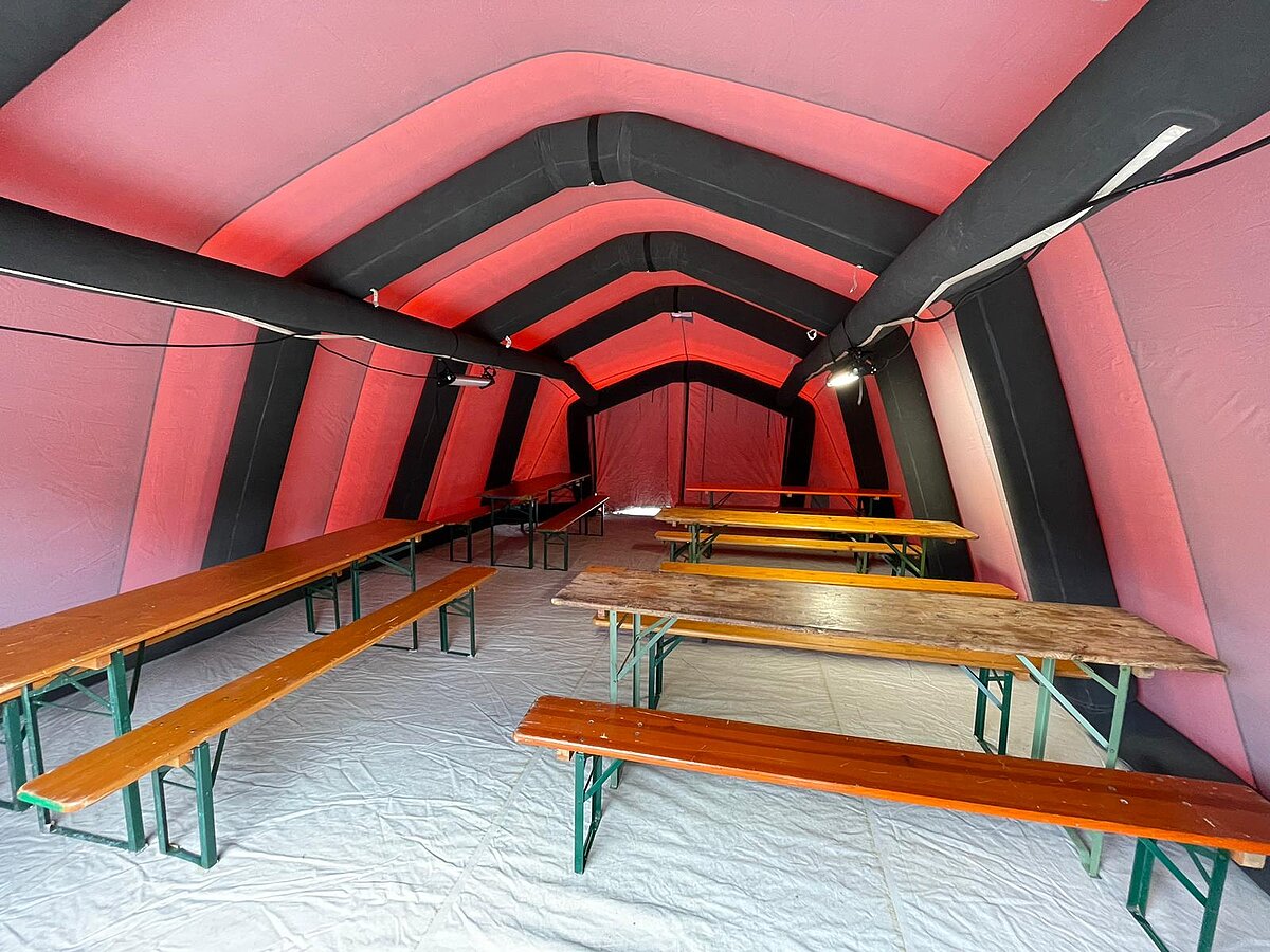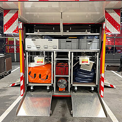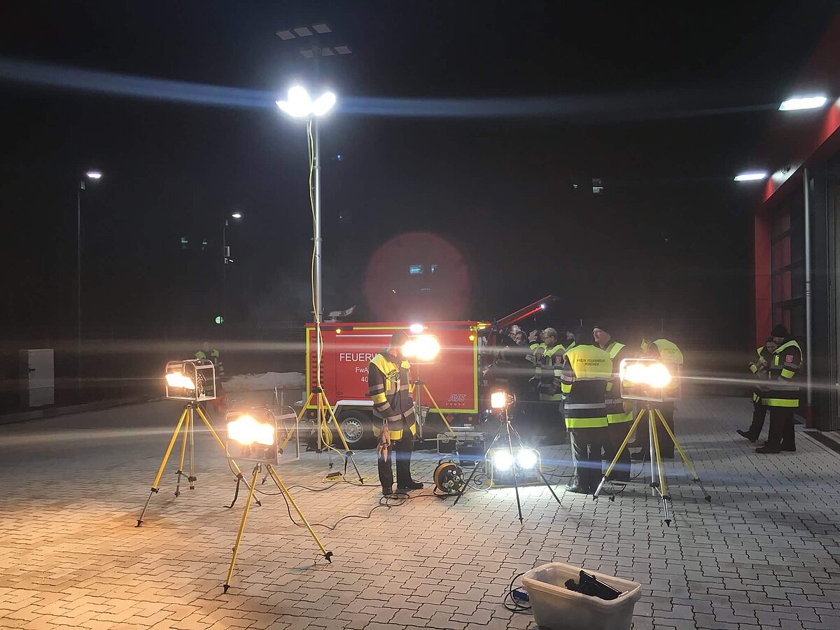 Der AB Unterkunft enthält unter anderem Zelte, Biertischgarnituren, Feldbetten, Heizung uvm. Der AB Dekon-Z dient als Sanitärbereich mit Duschen für Betroffene und Einsatzkräfte. Der Lichtmast-Anhänger schafft Licht und Sicherheit bei Dunkelheit im Bereich der Unterkunft.
